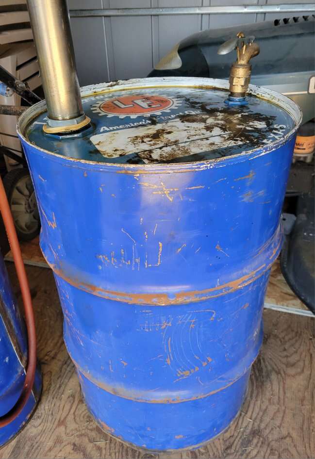 Lubrication Engineers brand 50 gal Oil drum with hand pump. Was used for clean oil is empty now but can still be used or just for garage decor