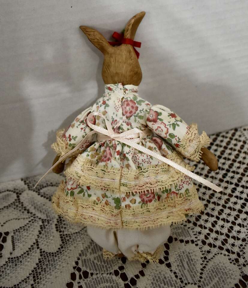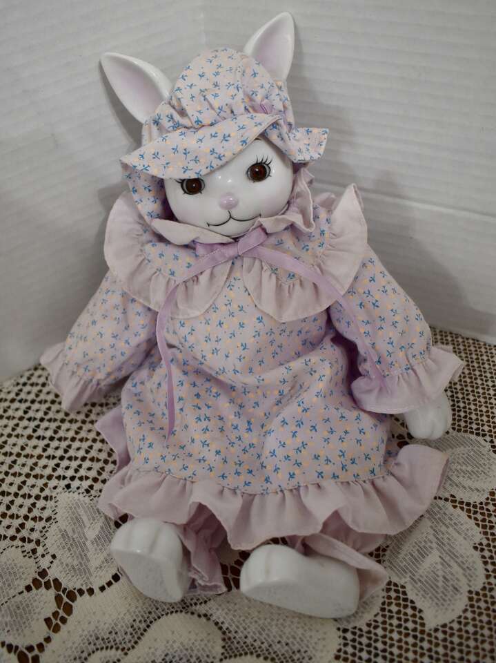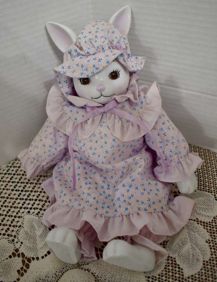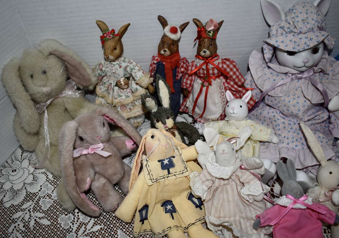 **IT MEASURES…**They Measure From.. For the Porcelain and Ceramic ones they measures Approx…From 15 1/2 inches tall for the Sweet Rabbit that is dressed in a blue and white pant outfit, 12 inches tall for the Pretty Porcelain Rabbit that is dressed in a pretty violet dress, 10 inches tall for the pretty rabbit dressed in a pink and tan dress, 7 inches tall for the red and white checkered outfit dressed rabbits, 6 1/2 inches tall for the undressed all ceramic rabbit that is jointed and 5 1/2 inches tall for the rabbit dressed in a white and yellow dress and for the Fabric ones they Measure Approx… 10 1/2 inches tall for the taller Boyds Collection Rabbit, and 8 inches tall for the undressed muslin fabric rabbit on down to approx. 5 1/2 inches tall for the rest of them.