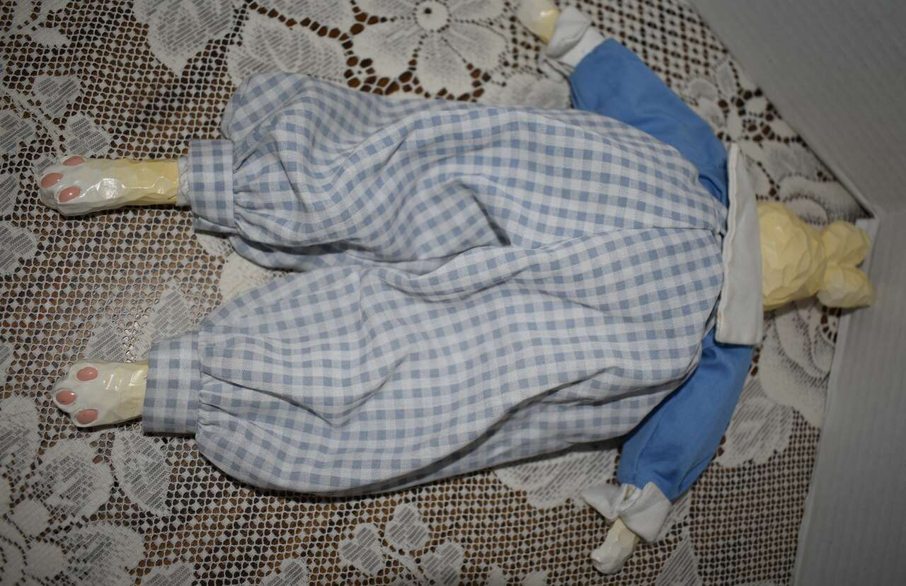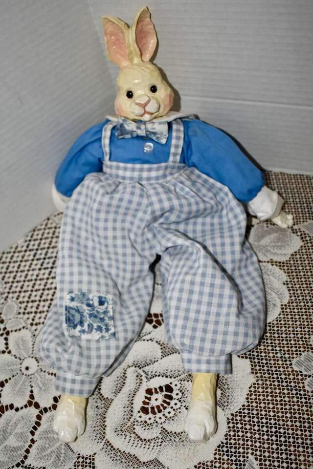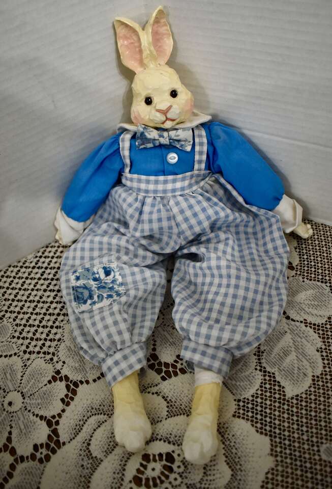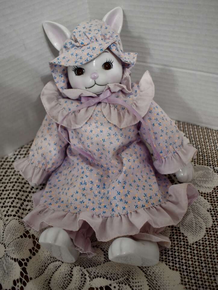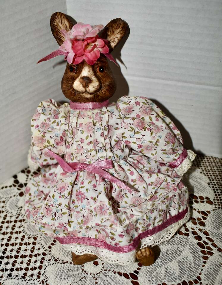 **IT MEASURES…**They Measure From.. For the Porcelain and Ceramic ones they measures Approx…From 15 1/2 inches tall for the Sweet Rabbit that is dressed in a blue and white pant outfit, 12 inches tall for the Pretty Porcelain Rabbit that is dressed in a pretty violet dress, 10 inches tall for the pretty rabbit dressed in a pink and tan dress, 7 inches tall for the red and white checkered outfit dressed rabbits, 6 1/2 inches tall for the undressed all ceramic rabbit that is jointed and 5 1/2 inches tall for the rabbit dressed in a white and yellow dress and for the Fabric ones they Measure Approx… 10 1/2 inches tall for the taller Boyds Collection Rabbit, and 8 inches tall for the undressed muslin fabric rabbit on down to approx. 5 1/2 inches tall for the rest of them.