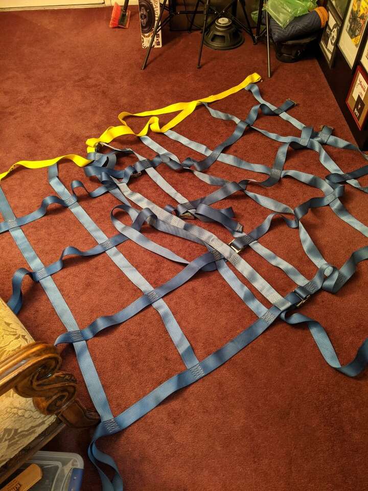 Venmo915lbs working load limit. squares are 14"x14", 4 squares vertically x 7 squares horizontally = (28-14" squares) length is 58" vertically and 140" horizontally. ALL straps have E track style connection points. straps have ratchet type hardware to cinch tightly. we bought a case of these a few months back, this particular cargo net was never used.