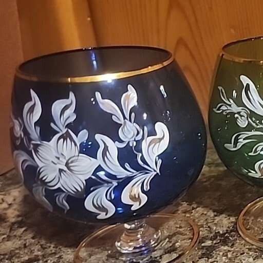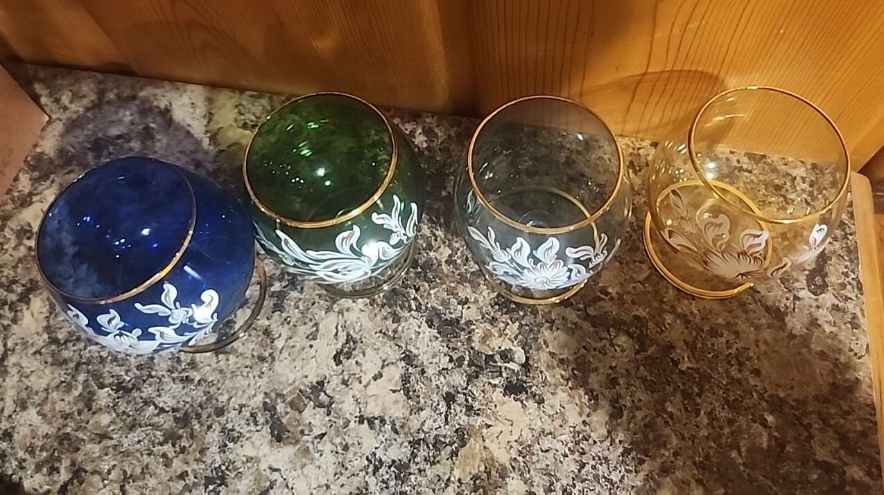 VenmoThis vintage Italian cordial glass set features four glasses with a beautiful floral pattern. The glasses are made of hand blown glass and feature hand-painted flowers. They come in dark blue, light blue, amber, and dark green. The production style is art glass and the glasses were made using a Czech Bohemian style. The set is perfect for collectors of vintage glassware and those who appreciate unique and beautiful designs. The glasses are perfect for serving and / or tasting any of your favorite beverages and would make a great addition to any bar or collection. Text only. Cash or venmo only.