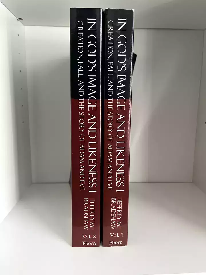 This two-volume set titled "In God's Image and Likeness" by Jeffrey Bradshaw is a thorough exploration of the Creation, Fall, and story of Adam and Eve. The book measures 11 inches in length, 8.5 inches in width.