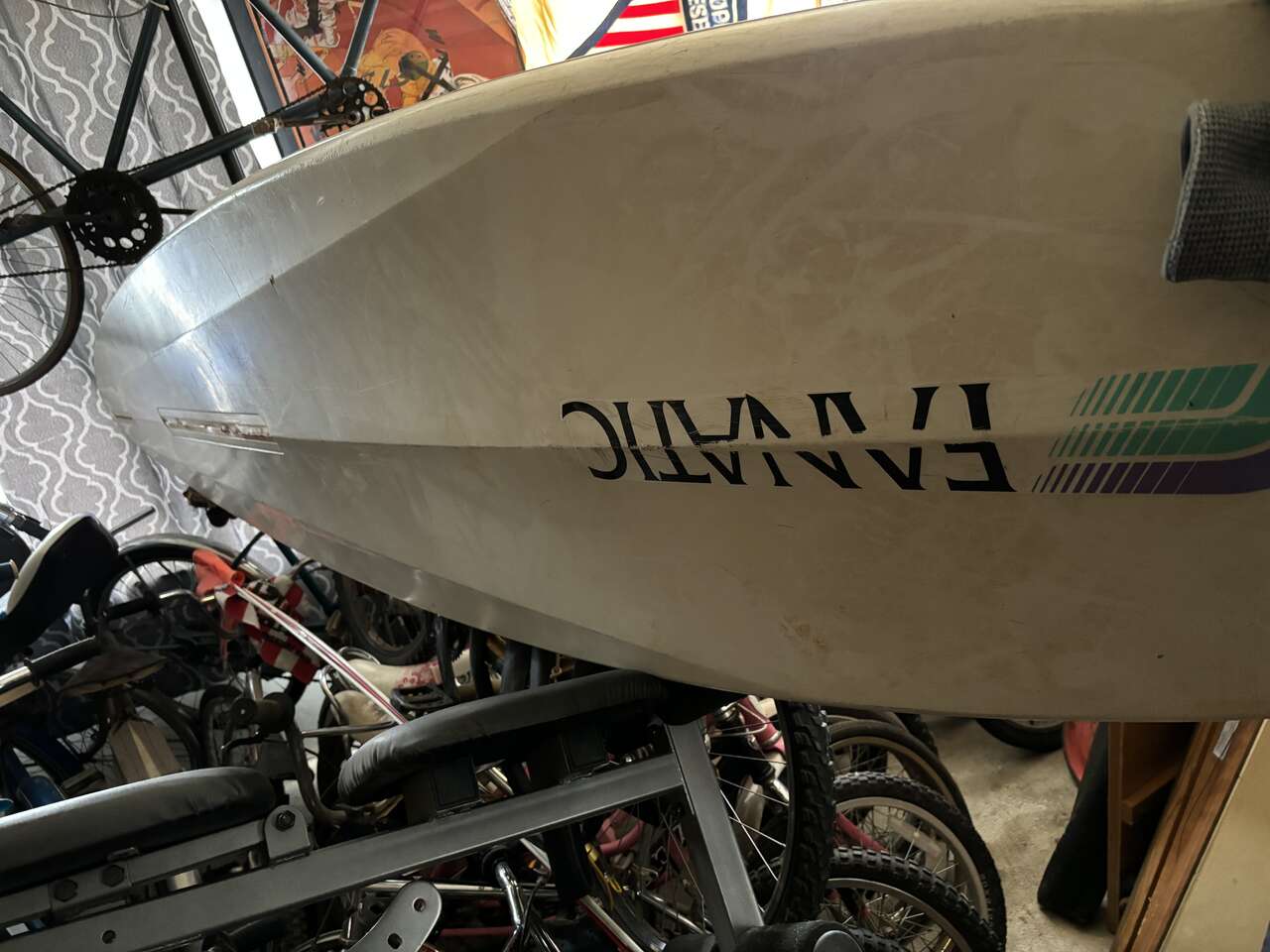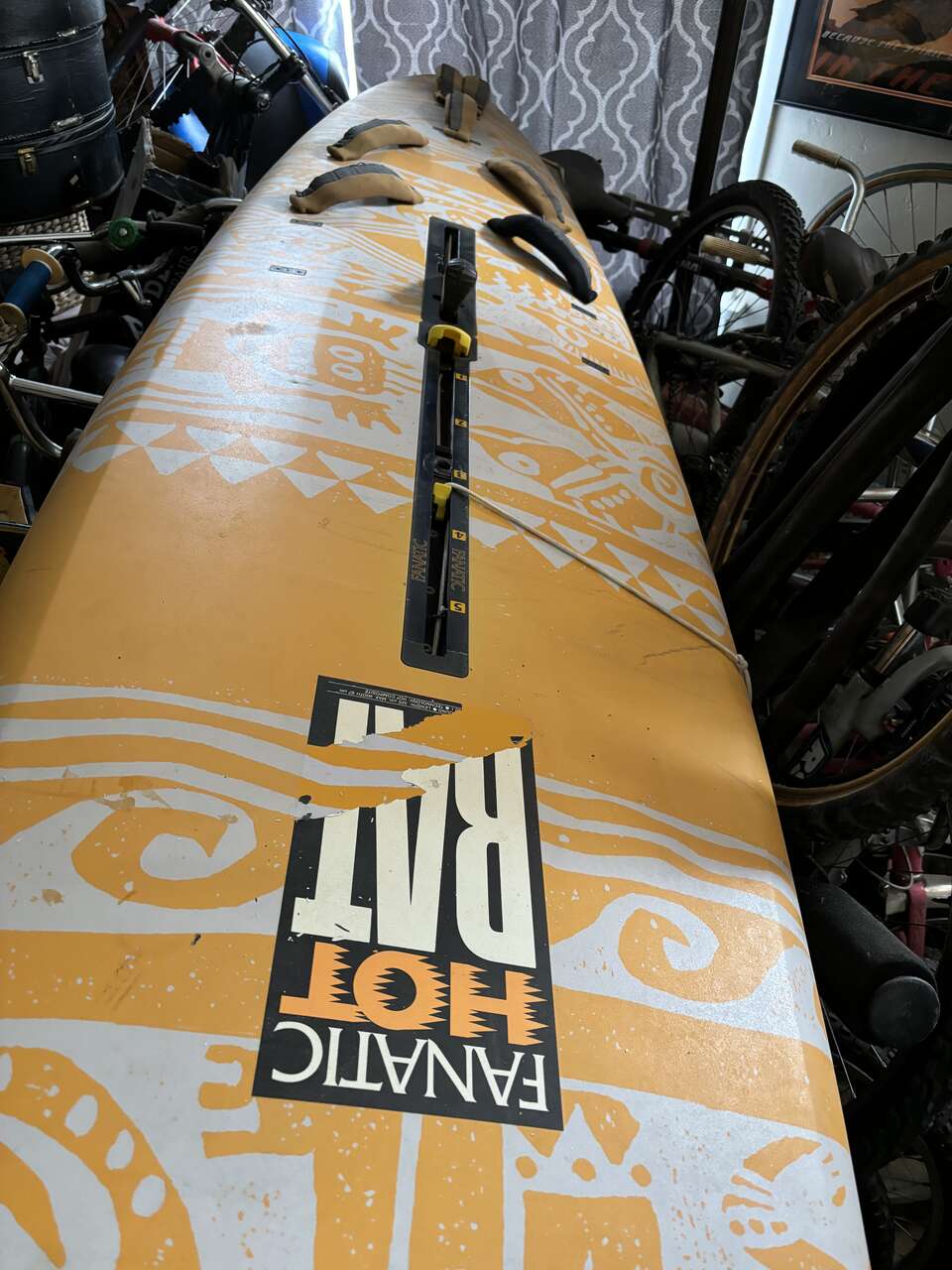 Vintage wind surfing set up. Board and sails, harness, Fanatic Bat is the board in excellent condition