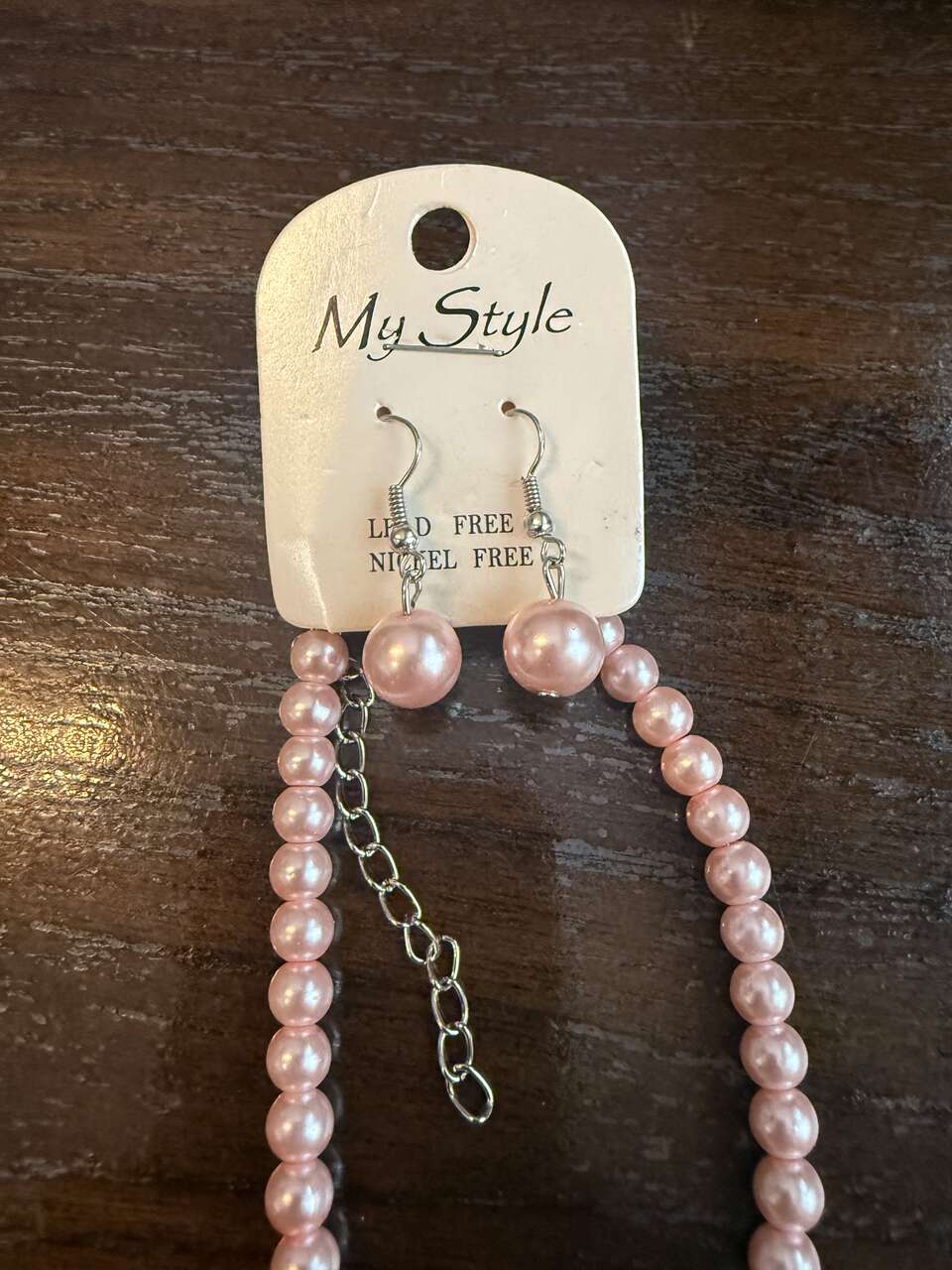 VenmoBeautiful pink pearl Necklace and earring set. It has nice detail on the necklace. Cash or Venmo.