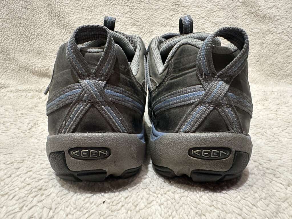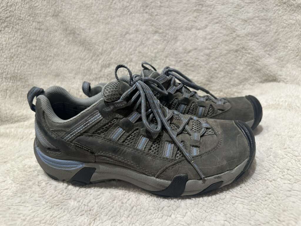 Keen women’s size 8.5 grey leather and mesh with blue trim, waterproof hiking shoes. These are in good condition, see photos for details. I take cash or Venmo, but cash is preferred. Text is best. 801-201-4446. Check out my other ads for additional sizes and styles.