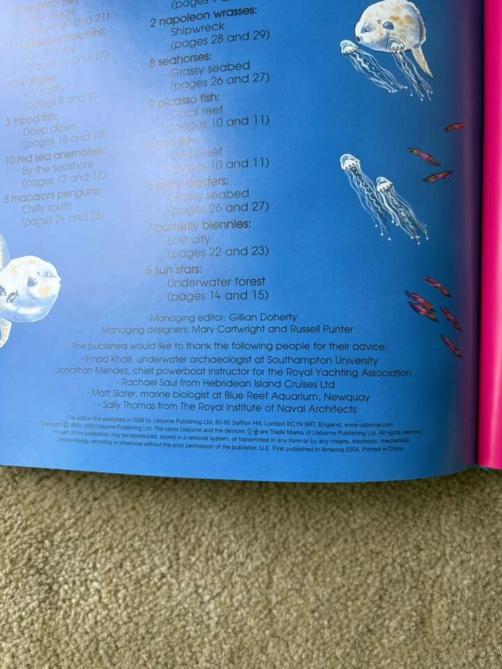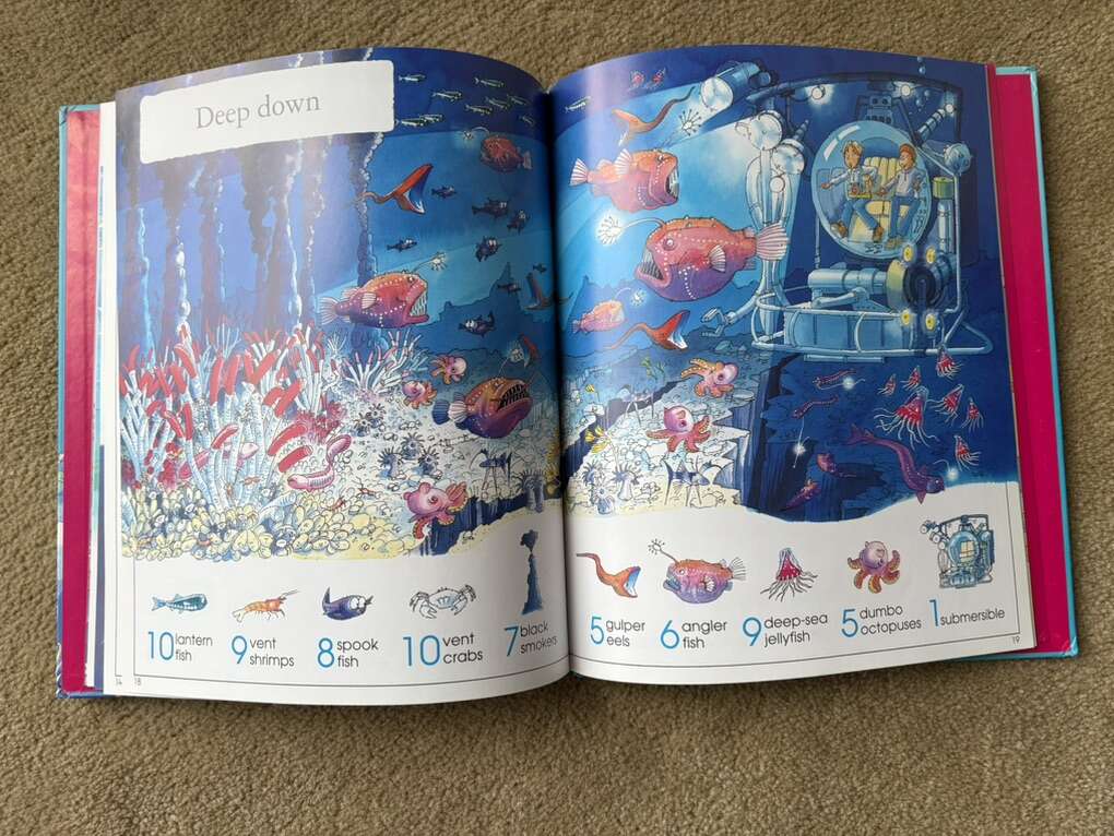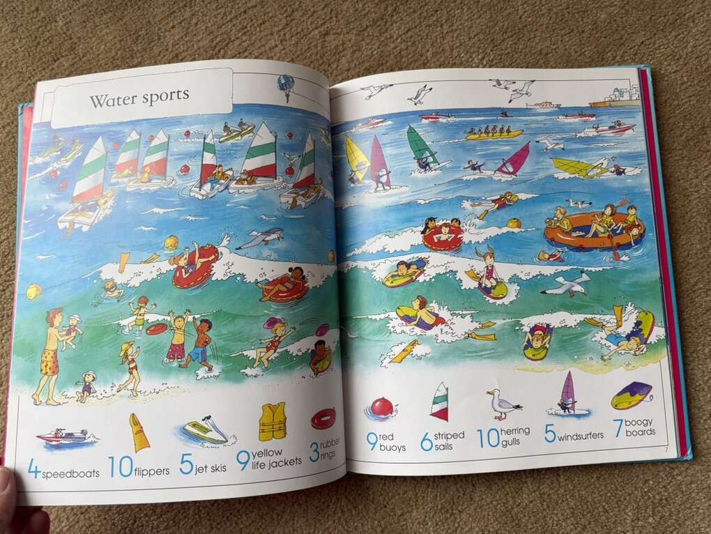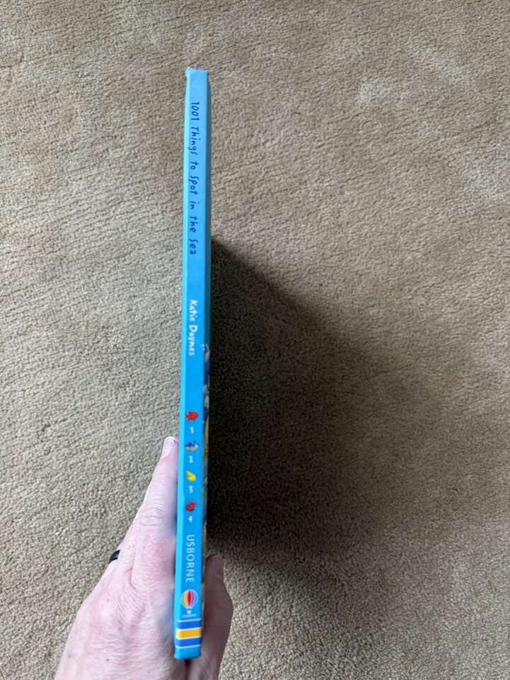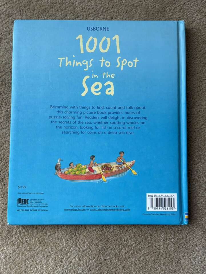 Usborne 1001 Things to Spot in the Sea. Fun search and find book full of puzzles and sea/ocean things to find. Soft hardcover in very good condition. No marks on pages. Corner slightly bumped (see photos). Text only. Cash or Venmo. Discount on multiple items.