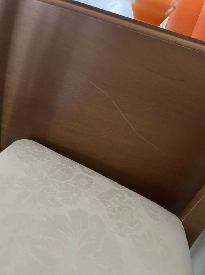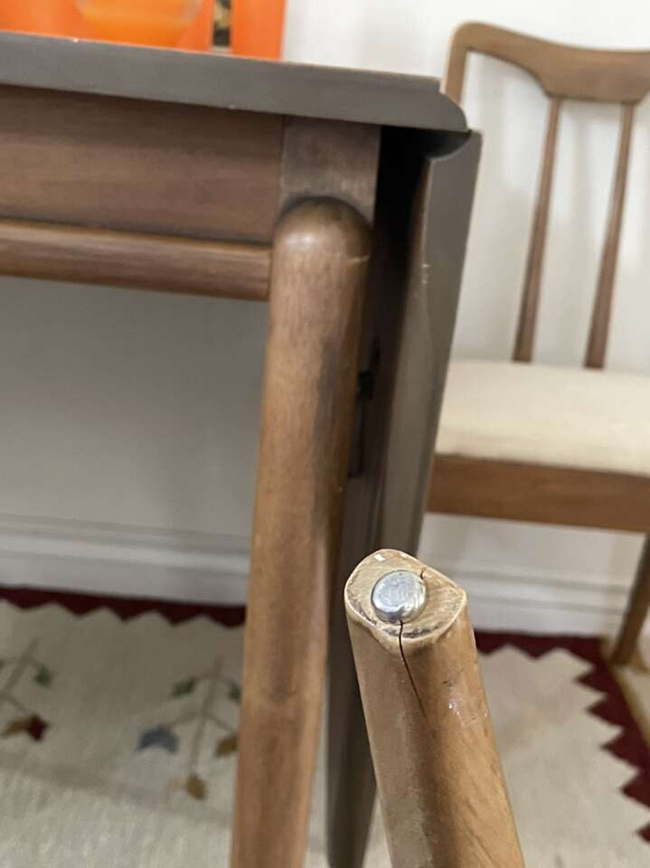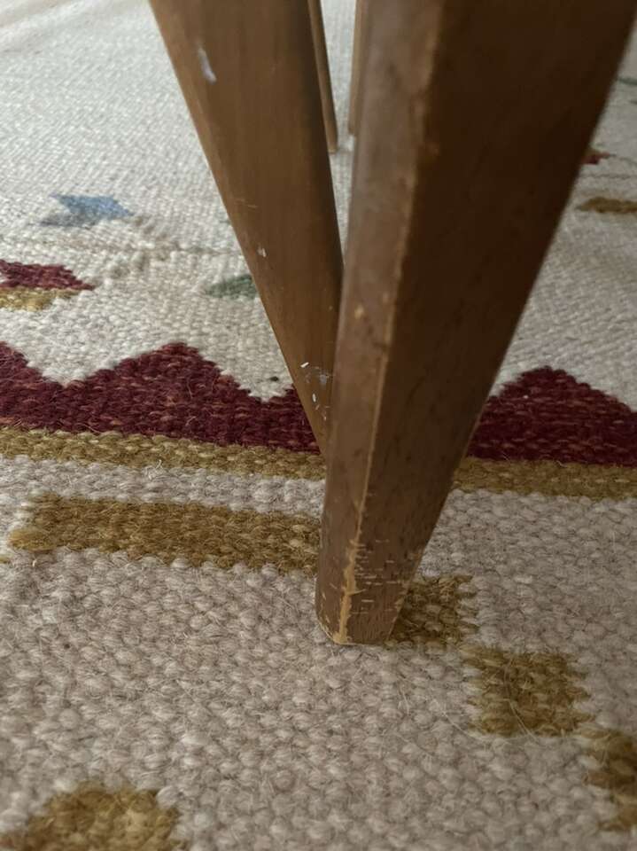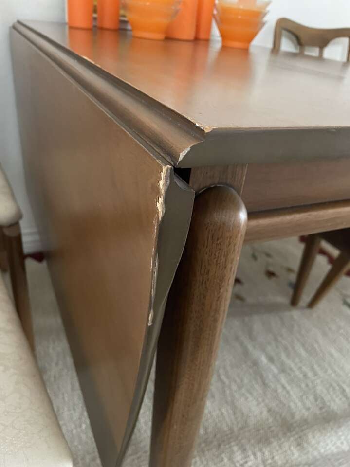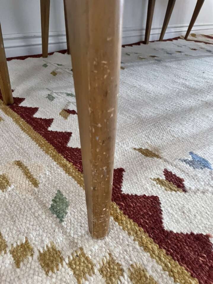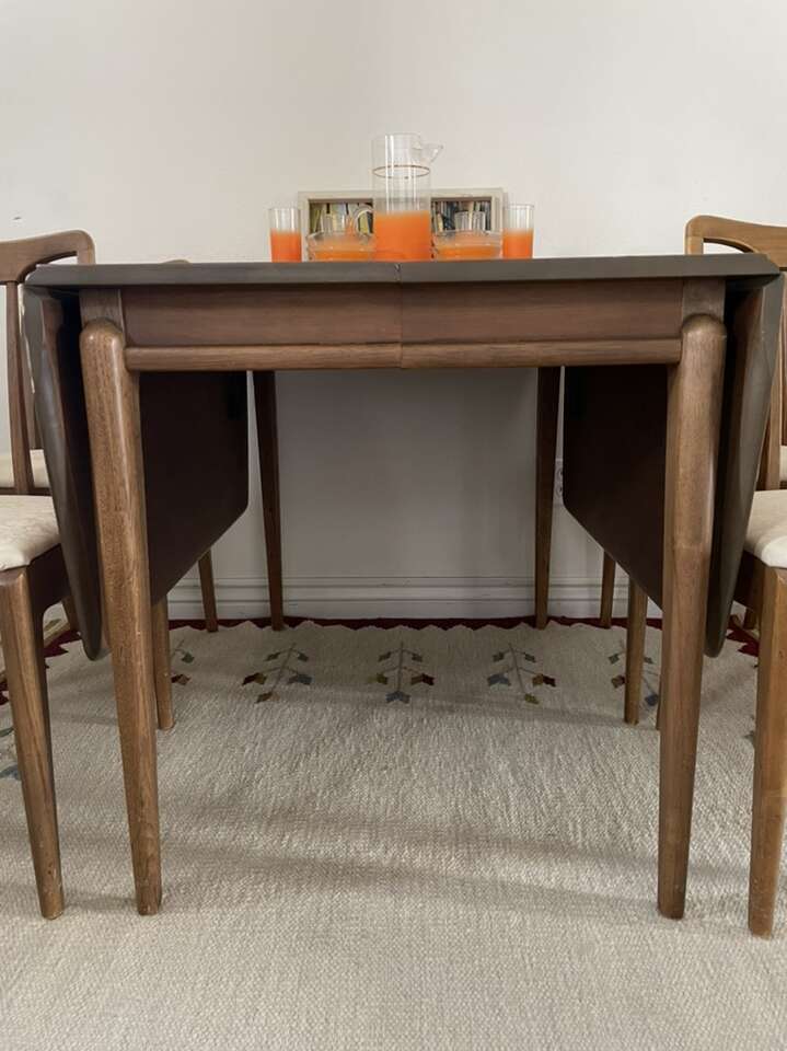 This vintage set is in fairly good condition. I think that I would rate it 8.5 out of 10. Major flaws are shown in the photos provided. The table is sturdy and the wings do not sag when it opened. Please note, that vintage designs are slightly more compact than modern ones. The asking price is $ 2000. I am not considering offers at this time.