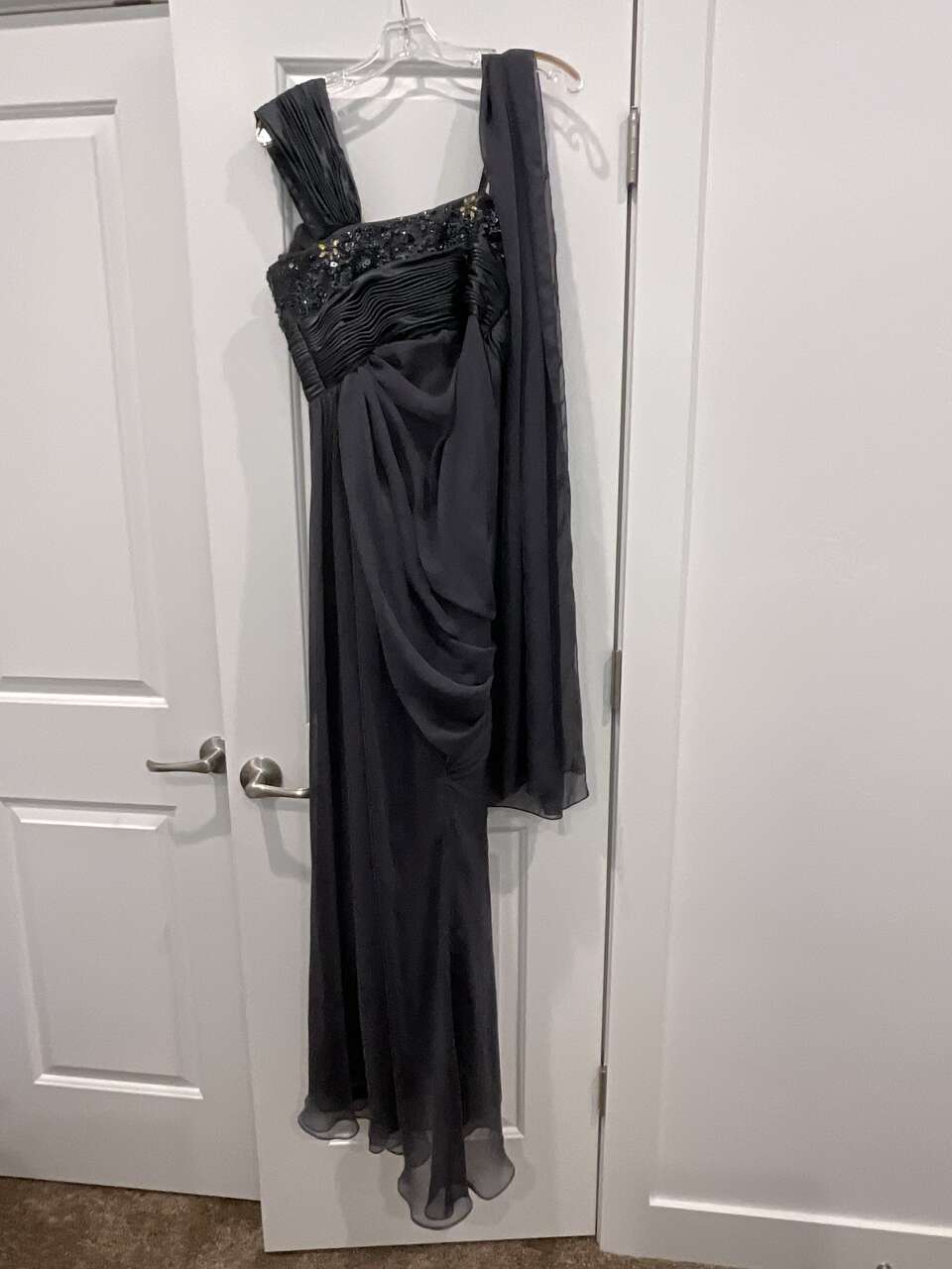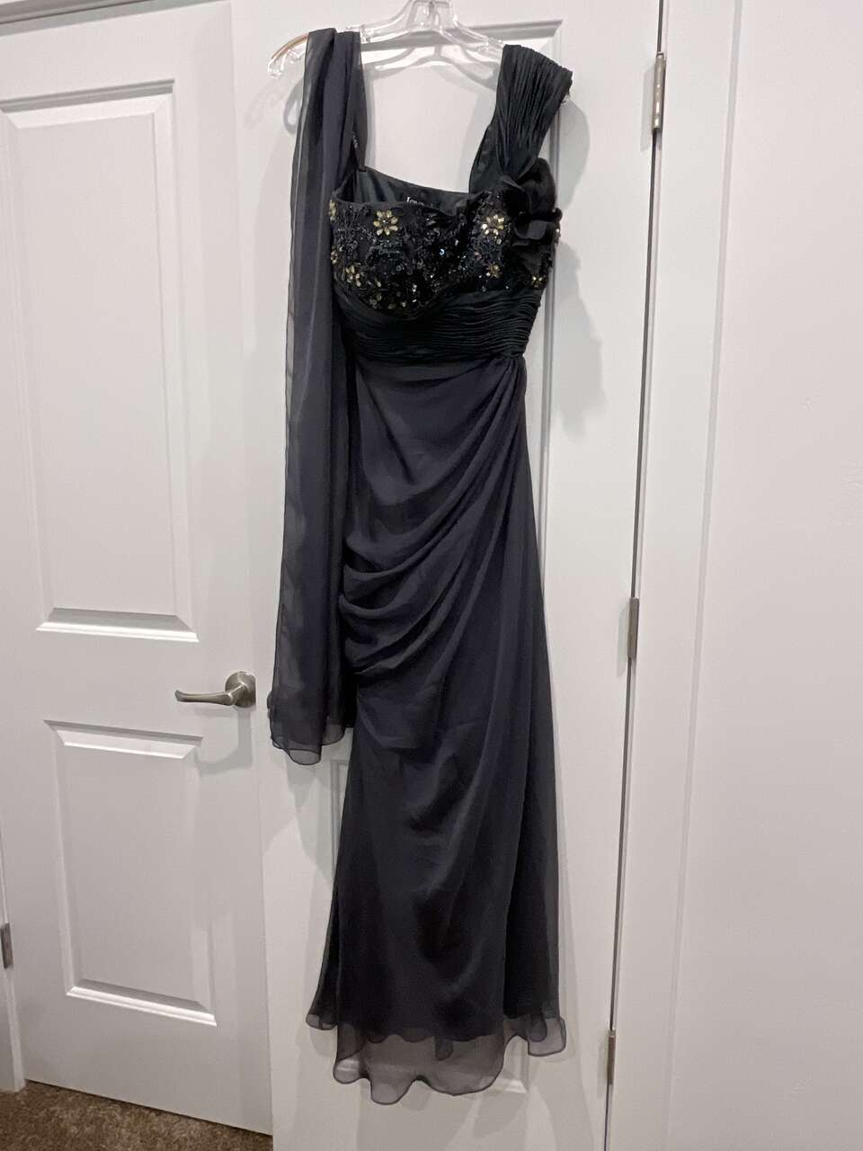 VenmoLong, Grey (Blue/Grey tones), One shoulder, beaded top with long sheer scarf and flowers sewn on. Size 8. Only worn once for wedding. $50 Cash or Venmo. Text 801-560-0659. No Codes.