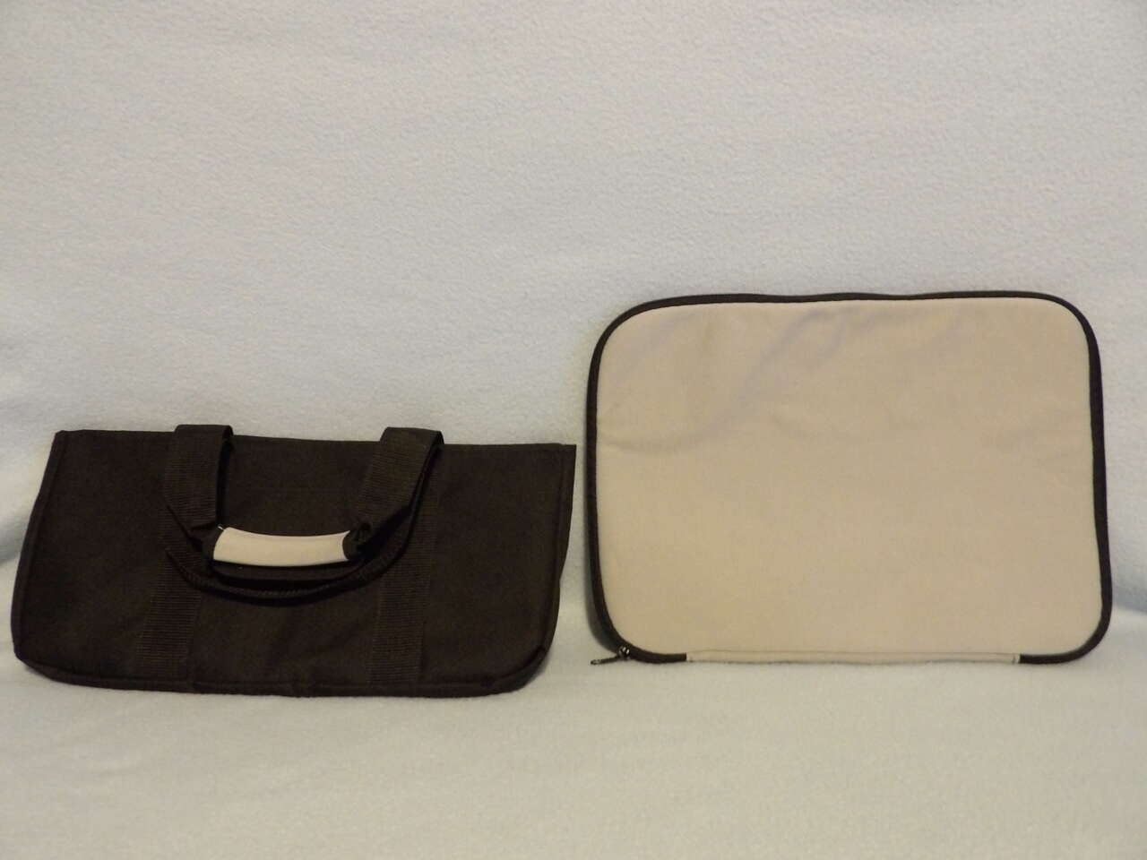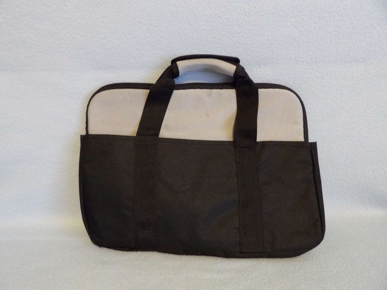 Protect your laptop with this soft grey zippered cover and black holder/handles. Lightly used. Has a small spot on it, but it's been washed, so it's clean.