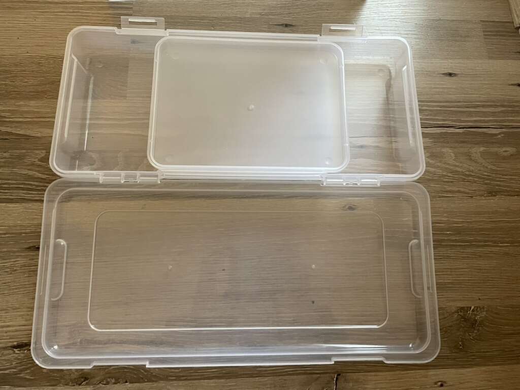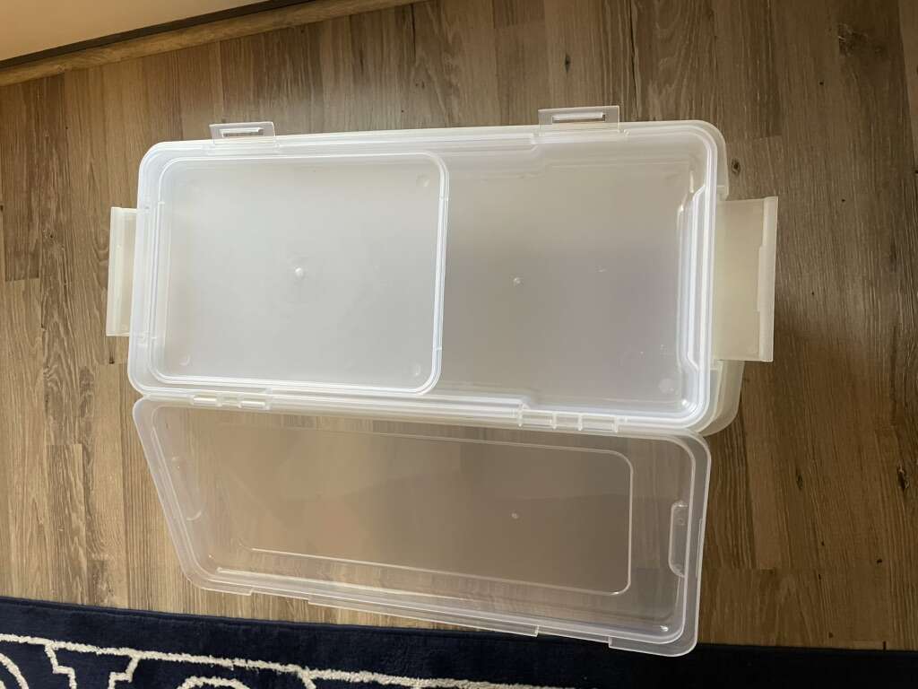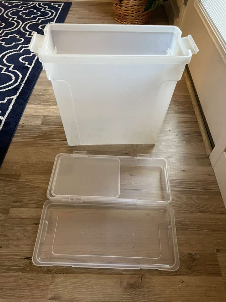 In great condition! There’s a separate, detachable lid for smaller items. Perfect for papers, crafts, or electronics.