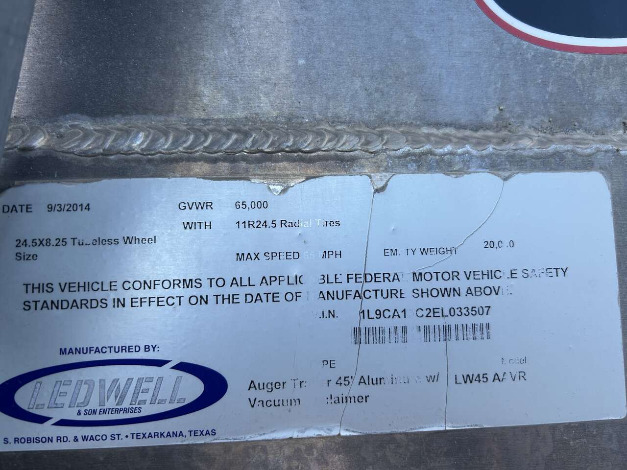 2014 Ledwell LW45AAVR Tri/A Vacuum Reclaimer Grain Trailer, 50'x98", 45' Tank Size, All Aluminum, 9 Compartments, Vacuum Reclaiming, Gardner Denver Pump- Hydraulically Operated, GVWR 65000#, Tri Axle - Front 2 Lift Axles, Drum Brakes, Air Ride Suspension, Aluminum Wheels, 10" Auger, 5 Shakers, Catwalk , Nice Trailer in Good Condition. Asking $49,500,00 - Located in Beryl, Utah