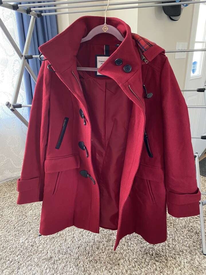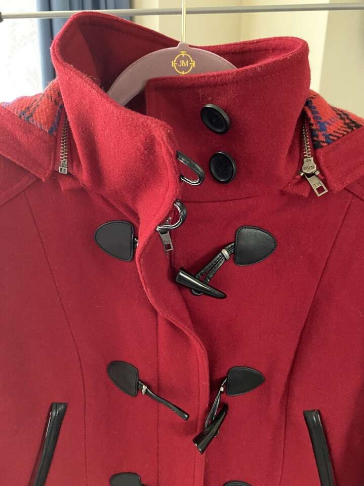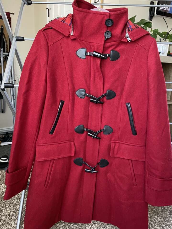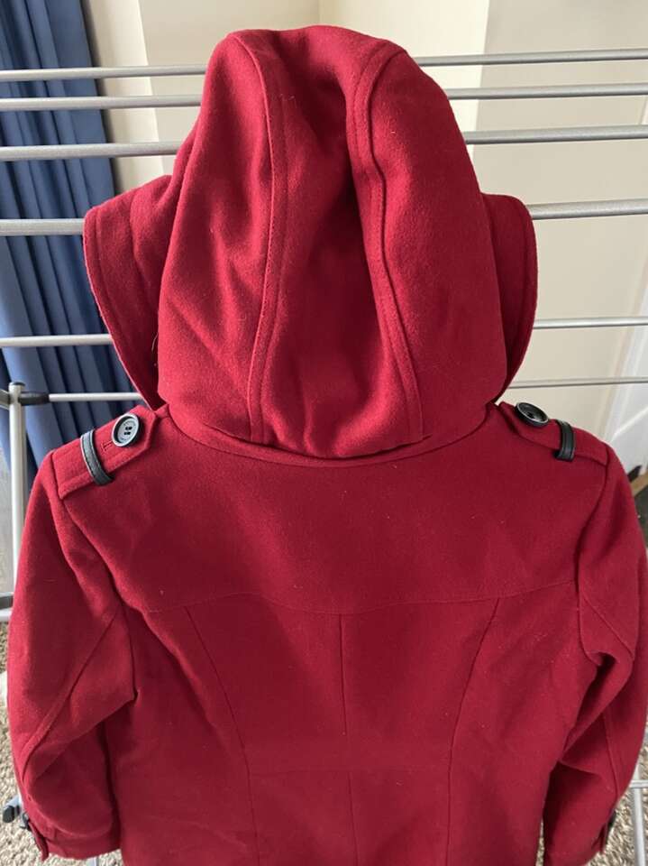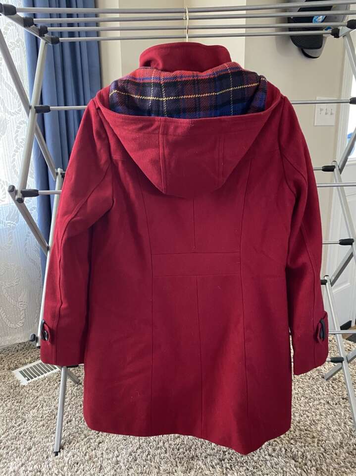 -Mid-weight -Toggle closure at front with faux-leather tabs Lined -Hits at thigh; approx. 33 long -Flap pockets at hips -Stand collar; attached hood with plaid lining -Shell: wool/polyester/nylon; hood lining: polyester/wool/acrylic; lining: polyester -Dry clean -Imported