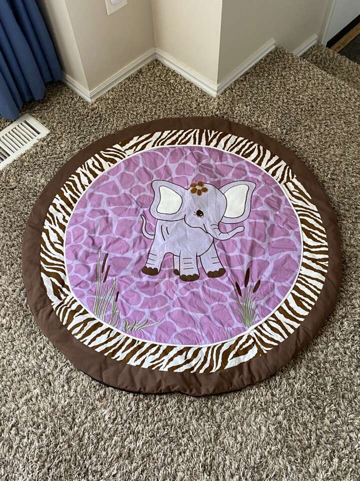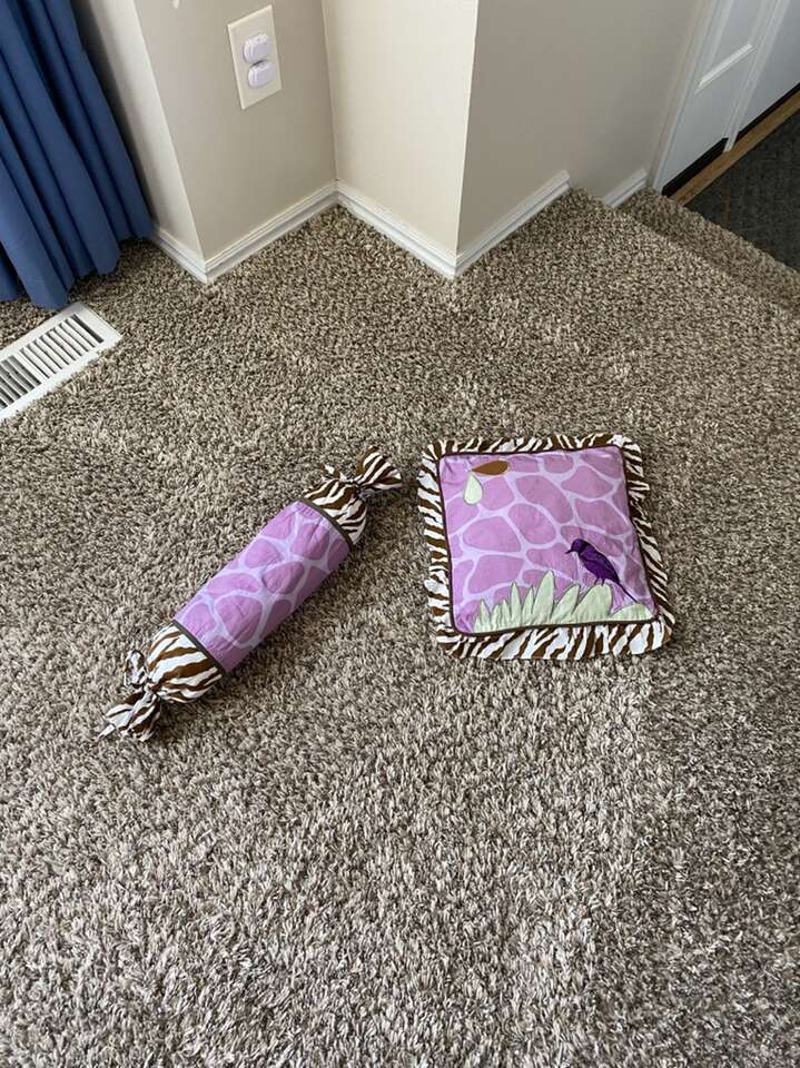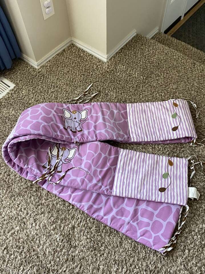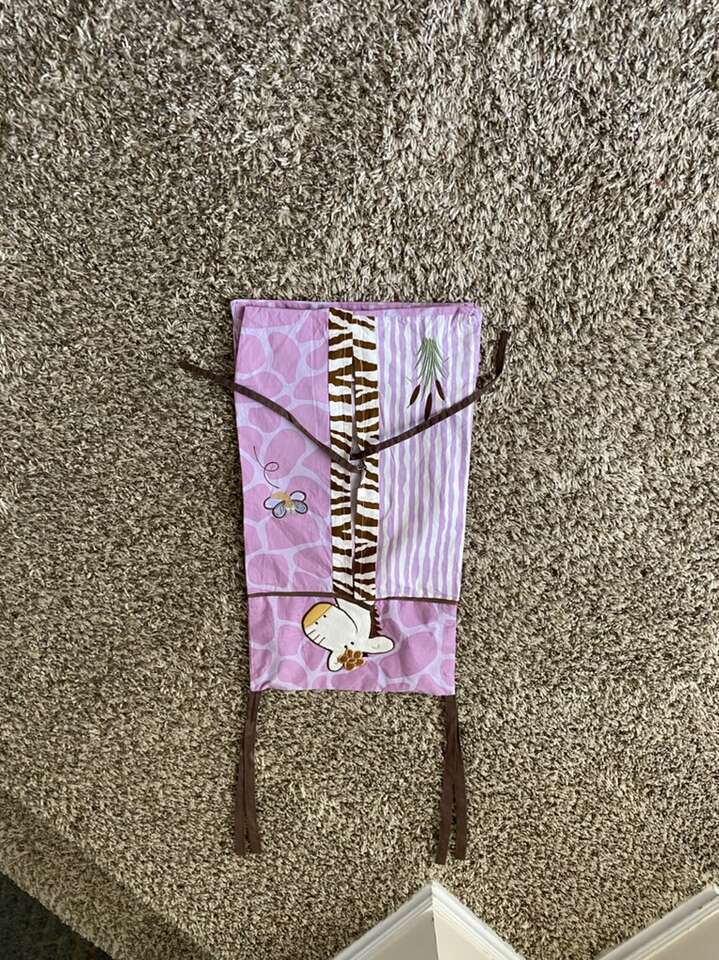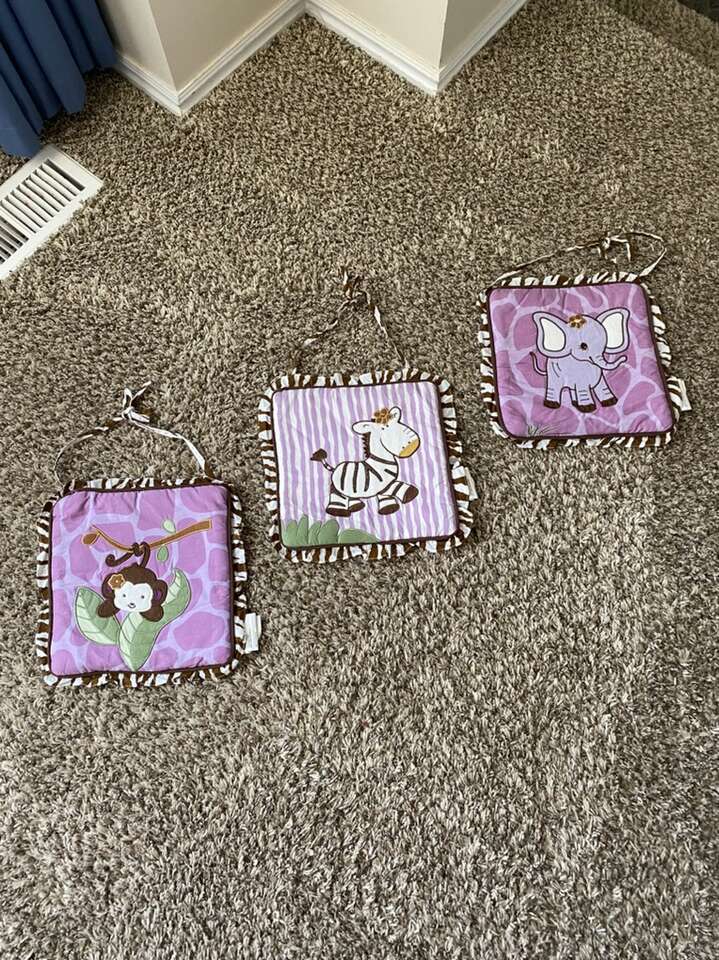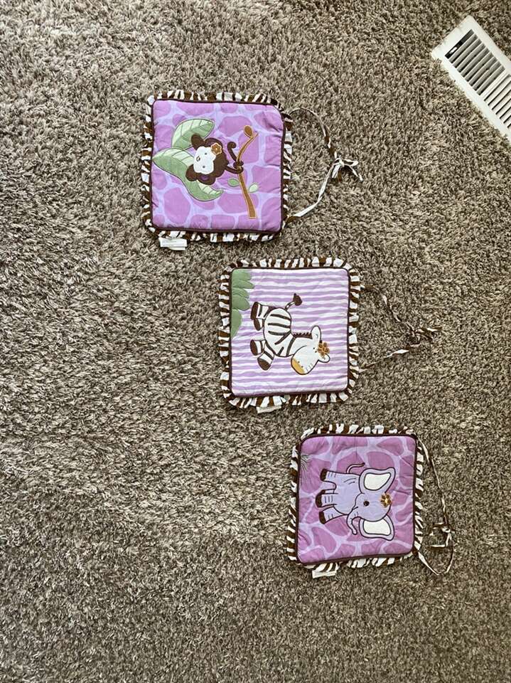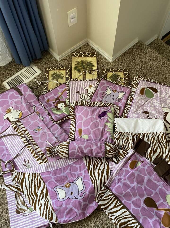 If you love color purple, this set is for you. All the stuff you need to get set-up for your new baby. Very beautiful color combinations of purple and brown. With tropical safari team.