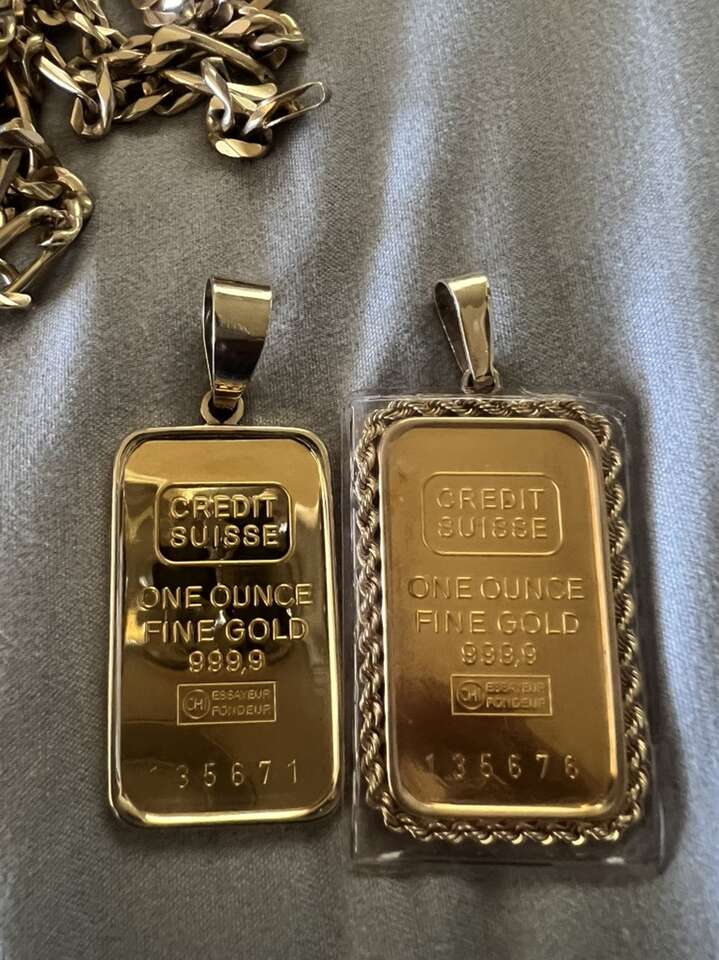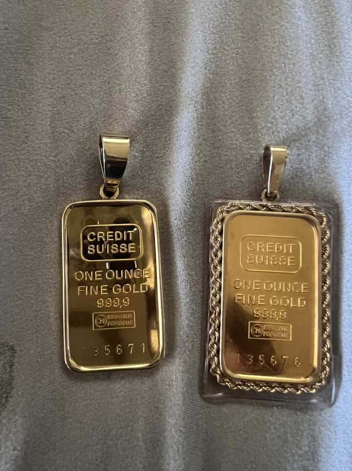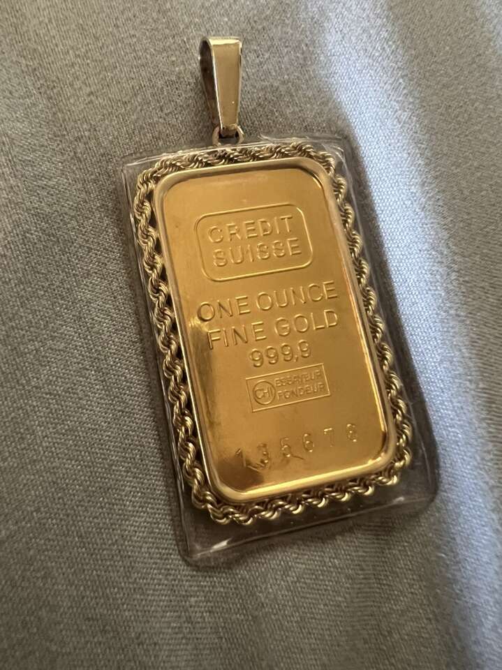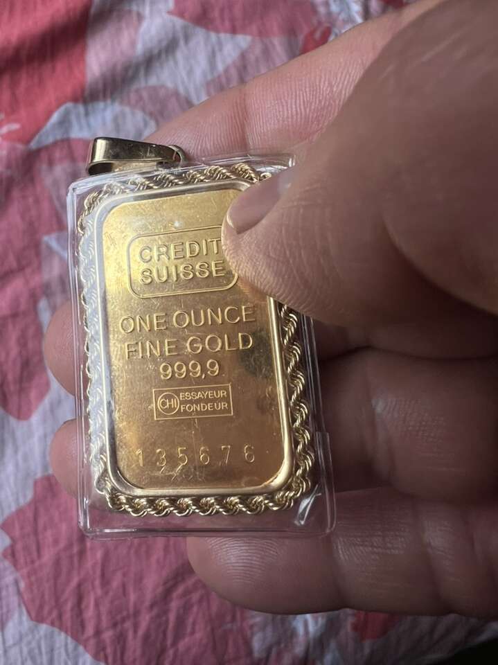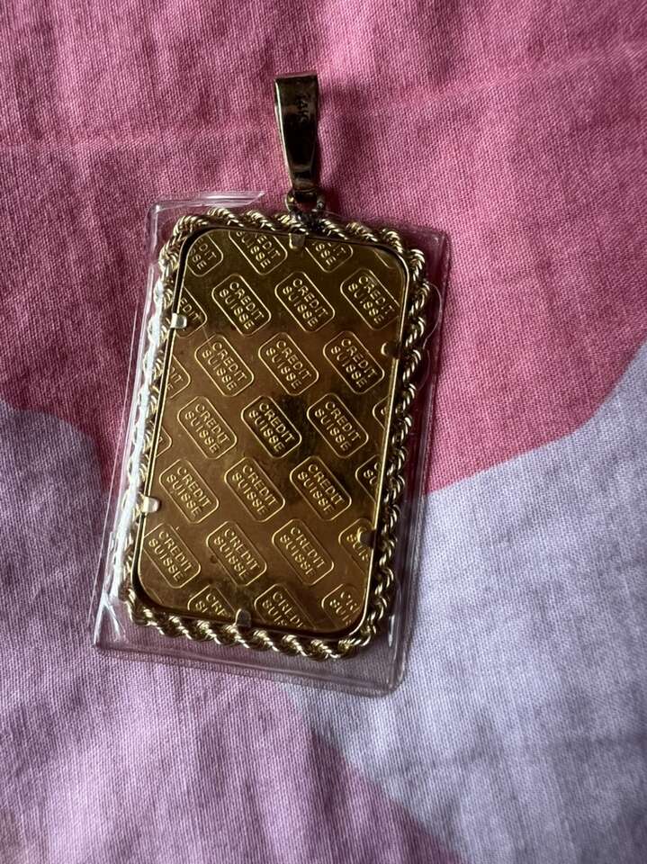 For sale 1oz. Credit suisse 999 fine gold bar whit bezel 14k. Antique gold bar really nice pendant . Asking price 5600. Cash only