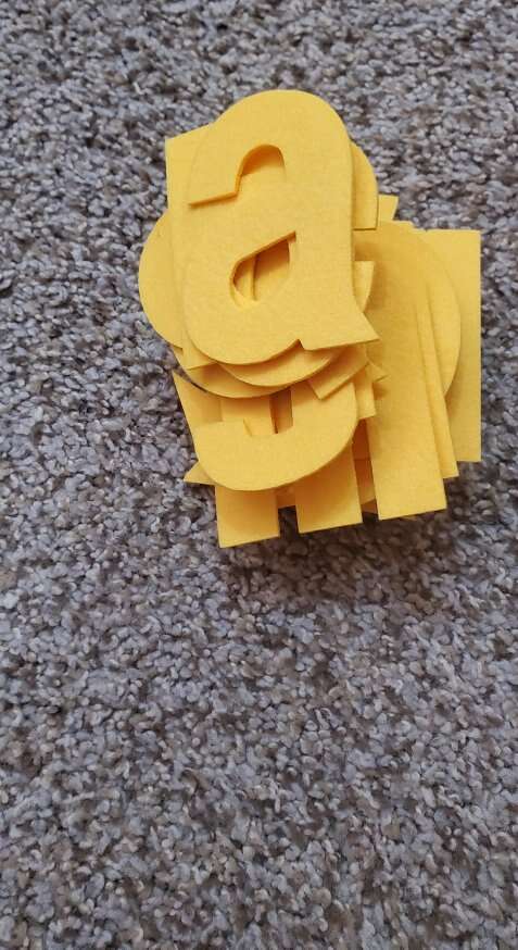 There is one full set of lowercase (yellow), 2 sets of numbers 0-9 (orange and green), one full set of uppercase (red) and one full set of signs and punctuation. On the yellow set, there is a small mark on the "s" as shown in a picture, otherwise, perfect condition.