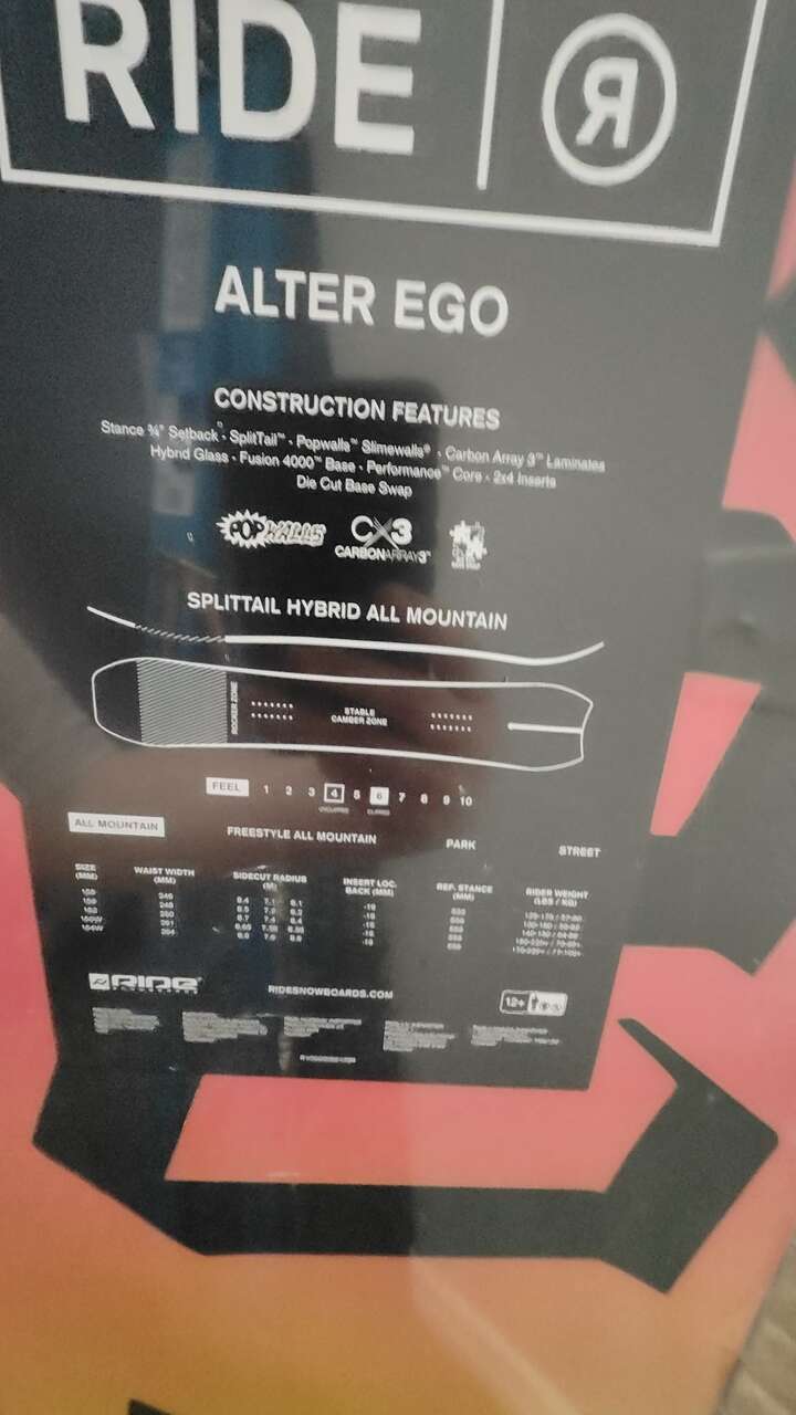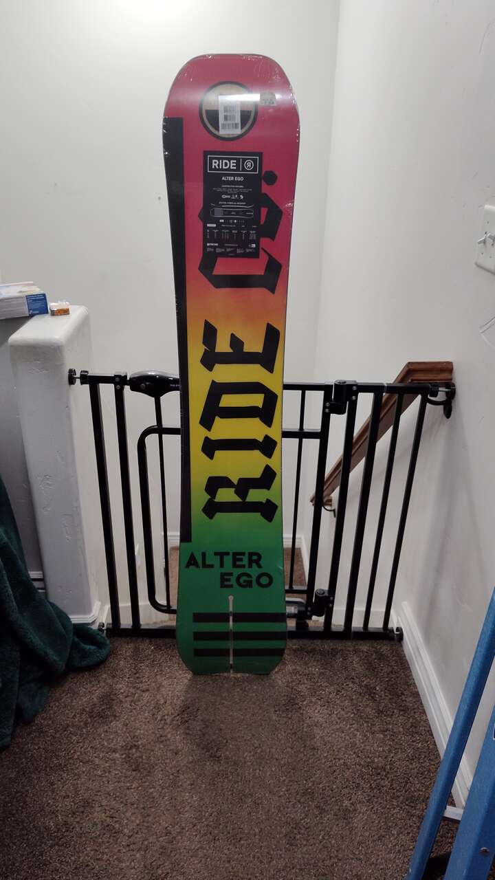 In original packaging. Ride Alter Ego Snowboard. Clip on split tail. 155cm. You can see I paid about $600 with tax. Asking $400, cash only. (I have two of these listed on ksl--one used and one new). I loved the first one so much I bought a second. I don't really Snowboard much anymore though.