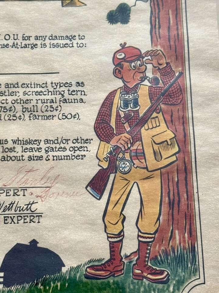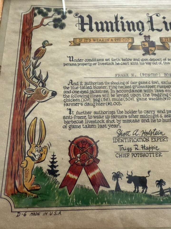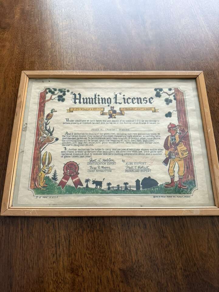 VenmoThis is a vintage 1955 Petley Studios (Phoenix, Arizona) Hunting License . If it's wearin' a red cap, it probably ain't a deer. Gag gift/funny/comical certificate for a great gift.. Great condition. See pics for detail. Great addition to your collection. Perfect addition to a man cave or cabin wall.