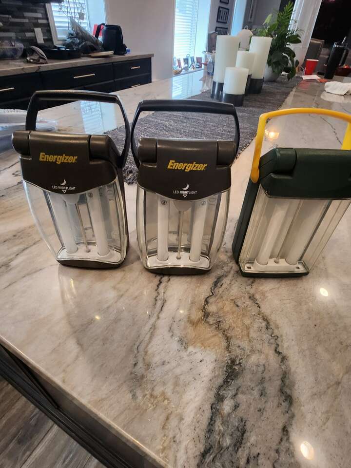 Two lanterns, all require 4 D batteries. The lanterns have had little use. Purchased to replace old ones used for camping, but then family promptly stopped camping. Intermittent use when power goes out, but don't need as many as we have. $5 each for lantern with a handle and $7 for lantern that is a lamp and clock (this one never used). Both for $10.