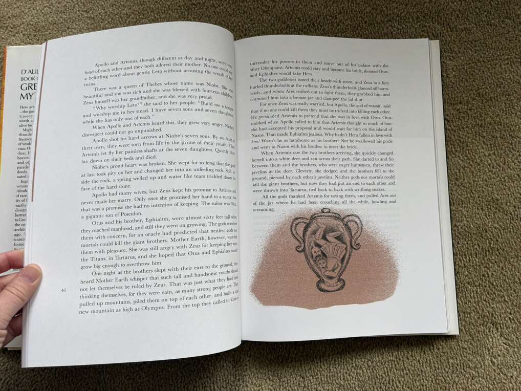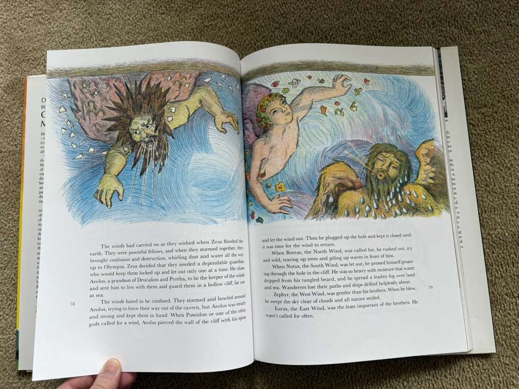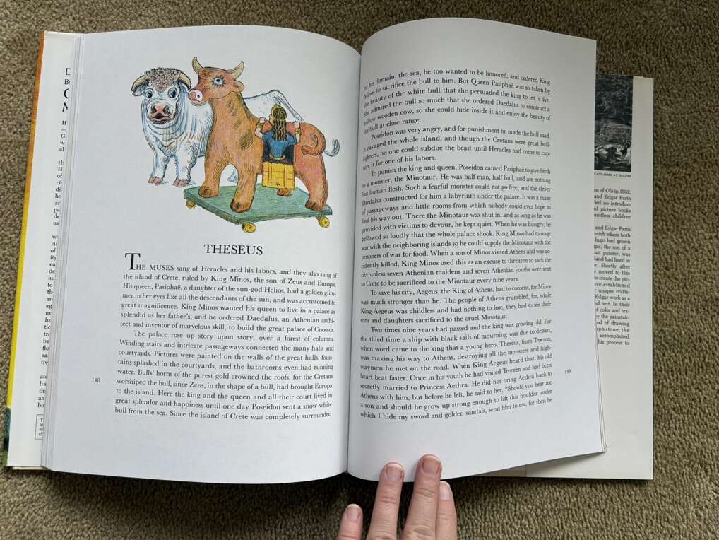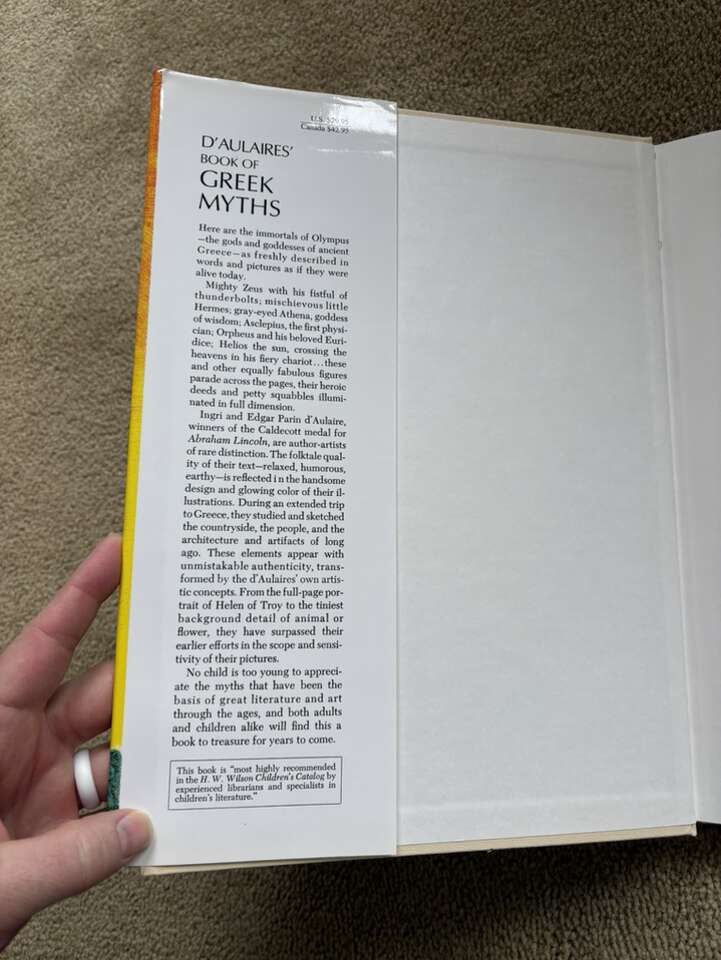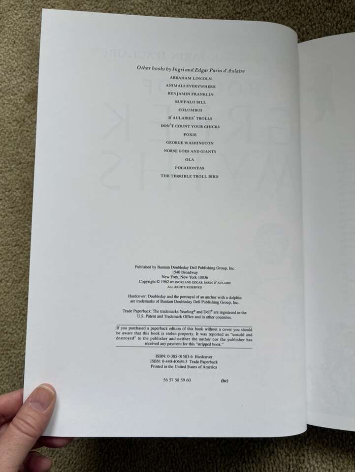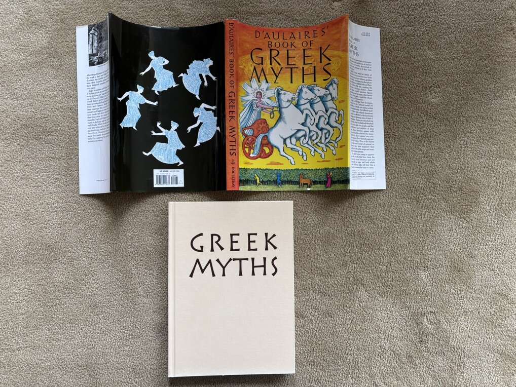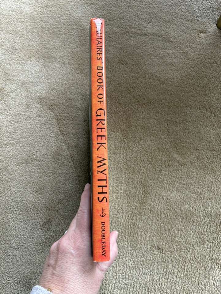Vintage D'Aulaires' Book of Greek Myths, by Ingri and Edgar Parin D’Aulaire. Doubleday, 1962. Beautiful oversized book of myths full of illustrations, both color and black & white. Hardcover in excellent condition, including dust jacket (one small tear at top of spine). Text only. Cash or Venmo.