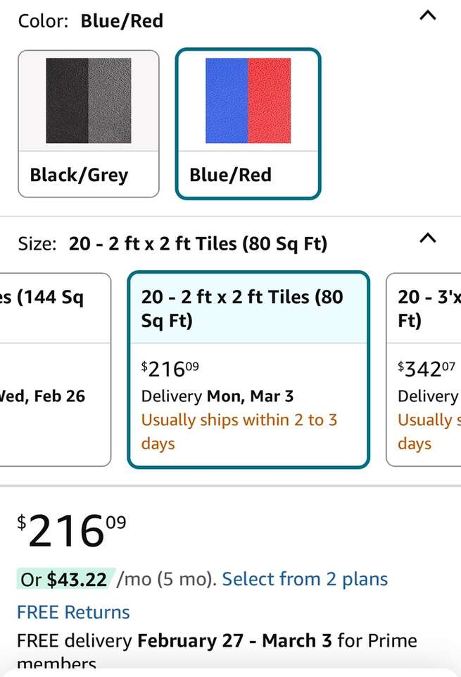 VenmoBrand new in box. 20 pieces of 2'x2' red or blue (one side red, one side blue) floor mat. Would be great as checkerboard or solid color. Great for home BJJ training or super tough gym floor to protect from dropping weights or equipment tearing up the floor. Was about $230 on amazon shipped with tax. Selling for $100 cash or Venmo.