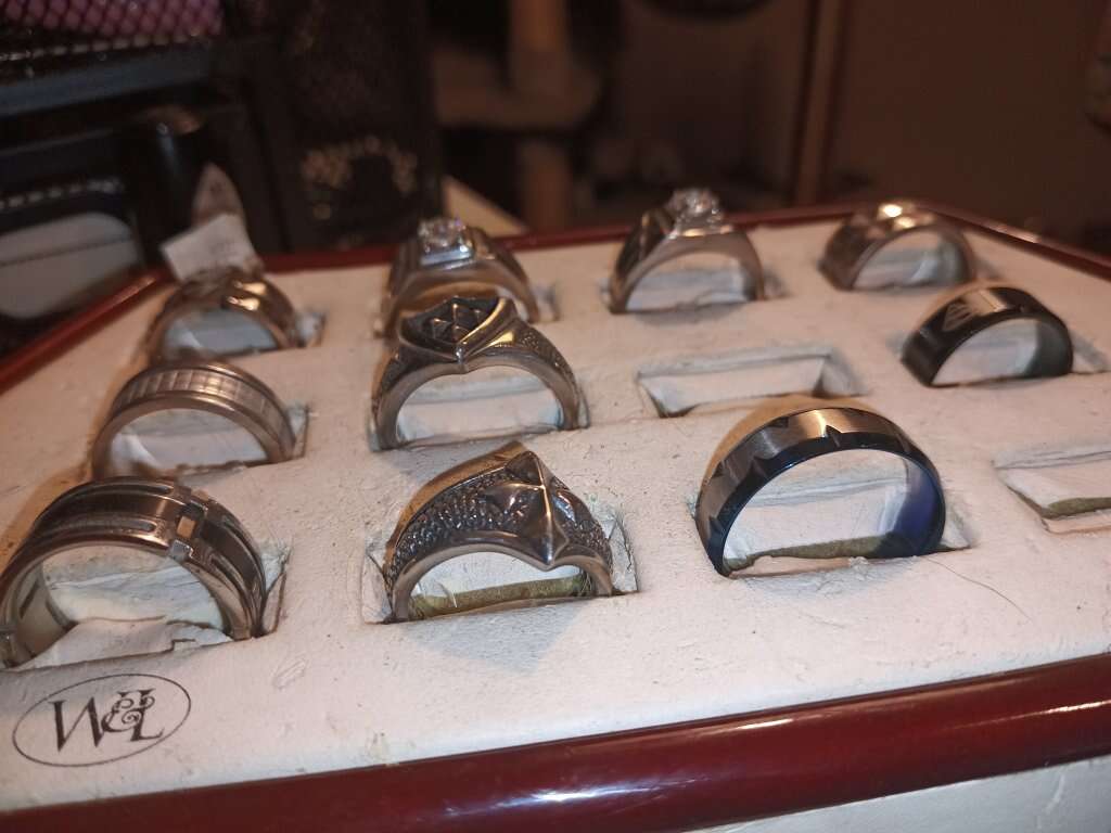 these are brand new my son used to have a shop in the mall, a jewelry shop, and here's some leftovers I think one of them is the tennsin ring, they're stainless steel, the sizes are a little bit bigger like around 10-11 and 12 so if interested let me know. so price depends on the ring so just hit me up, cash only.