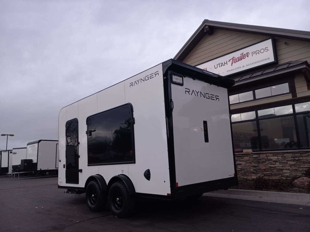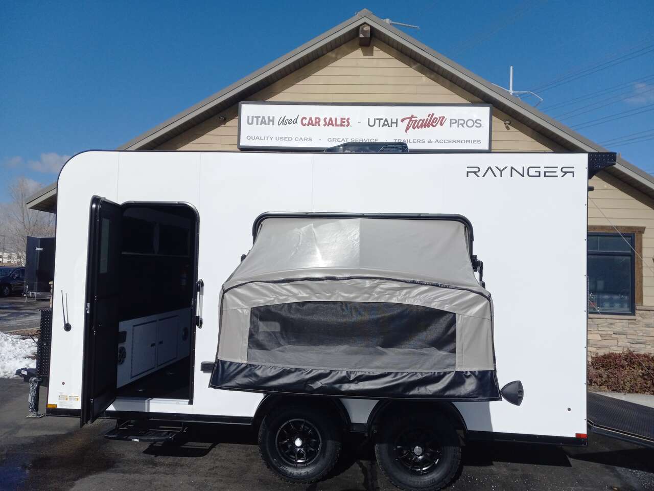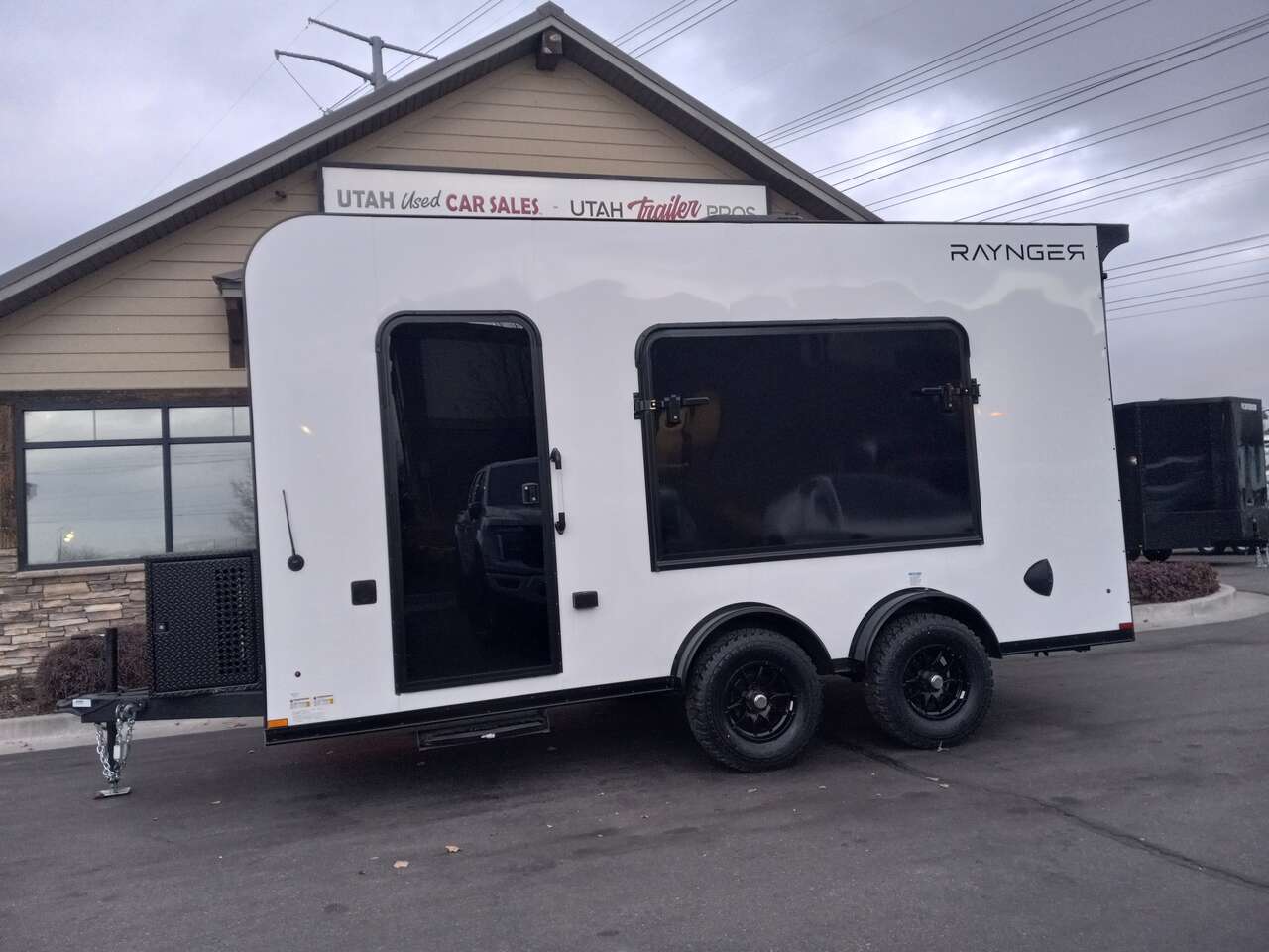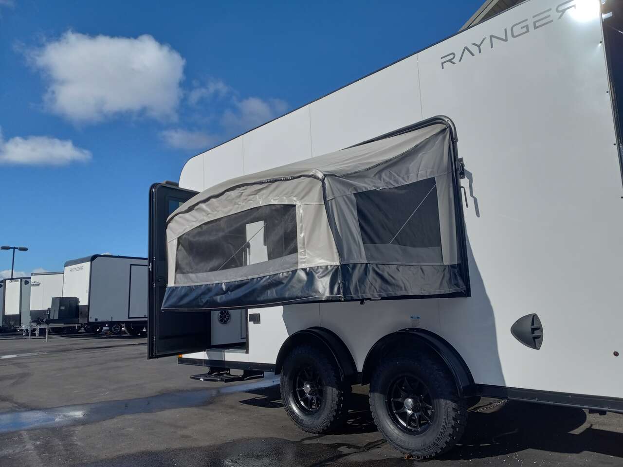 LIMITED TIME $224 A MONTH WITH ZERO DOWN WITH OUR SPECIAL LOCAL CREDIT UNION PARTNER!!! NO PRE-PAYMENT PENALTIES!!! NEW 7.5 WIDE MODEL!!! FITS ANY STOCK SIDE BY SIDE UTV!!! RAYNGER PREMIUM OFF ROAD TOY HAULER CAMPER!!! 18 INCH GROUND CLEARANCE!!! OFF ROAD TIRES!!! FULLY INSULATED!!! HEATING AND A/C!!! WET SOUND STEREO!!! FOLD OUT/POP OUT TENT WITH MATTRESS!!! 84 Inch Rear Entry Height/87 INCH INTERIOR HEIGHT!!! 83 Inch Rear Entry Width!!! Ventilated Locking Generator Box!!! UPGRADED TORSION AXLES!!! 14.2 Foot Long Garage Space!!! And Much MUCH MORE!!! Check out our Specs!!! Also available in 18 foot models. 18 Foot Models can have 3 Fold Out Beds/Pop Out Tents. 16 Foot and 18 Foot Models will fit ANY stock 4 Seater Side by Side • 6” I Beam Frame• Flat Top Design• Flat Front Design• Wall Posts 16” on Center• Cross Members 16” on Center• Roof Bows 16” on Center• Rust Inhibiting Z-Tech Protection on Chassis• Ameraguard on Tongue• Ameraguard on Rear Bumper• Ameraguard Around All Door Openings and Stepwell• Ameraguard Around Edges of Ramp Door• 3500 LB Spring Axles• 2-5/16” Coupler• One-Piece Aluminum Roof• ST235/75R15 Aluminum Wheels with Chrome Center Caps• 2000# Ramp Door with Eberhard Latch• 30” Tempered Glass RV Door with Screen Door• .030 Exterior Metal with Screwless Sides• 24” Black Stoneguard• 3” Black Bottom Trim• Sand Pad• Black Door Hold• 2.7mm Charcoal Textured Vinyl Ceiling • 9mm Charcoal Textured Vinyl Walls• 3/4” Engineered Wood Floor with Rubber Coin Overlay• (6) 1200 LB Floor D rings Installed with Backer Plates• LED Clearance Lights and Tail Lights• LED Back-up Lights• No Show Wheel Box• Spoiler with Toggle Switch• RV Step• 7’ Interior• (2) 17” Chrome Base Lights with Switch• (1) Black 17” Spot Light with Switch• (1) 30 Amp Panel with Marine Plug• A/C Unit with Heat Strip• (3) Interior Recepts• (1) Exterior Recept• 12V Battery and Charge Line• Prep for Backup Camera• Wet Sounds System• (3) Blue Interior Cabinet Lights• (1) 6’ Section of Flex Lights• Black ATP Rear Header and Hoop• Black ATP Fenders• Insulated Walls & Ceiling• Base Cabinets• Overhead Cabinets with Netting Over Compartments• Pop Out Tent• Black ATP Storage/Generator Box Mounted On Tongue 2SW094859