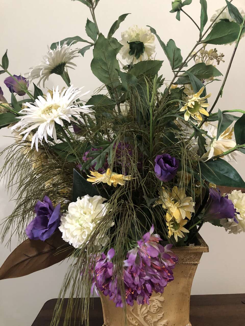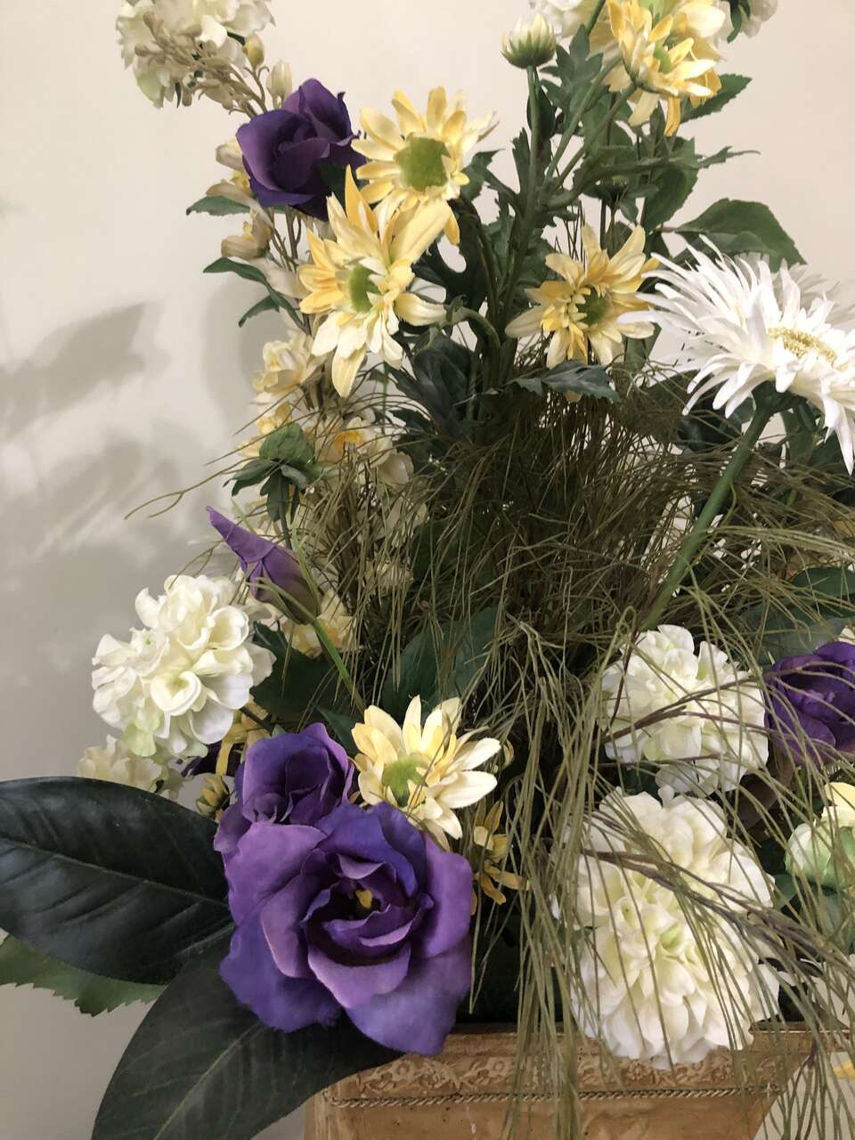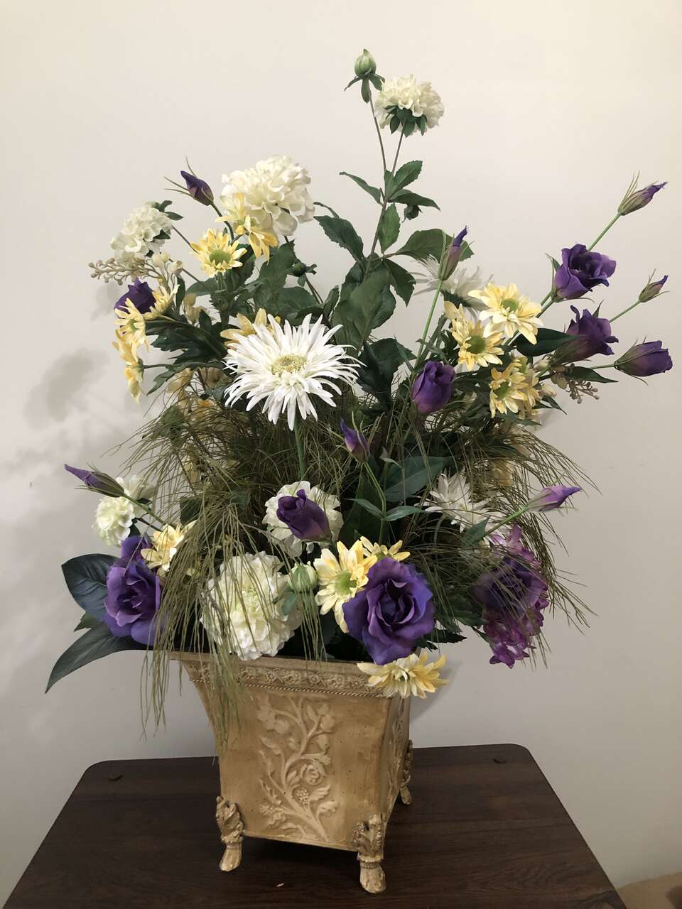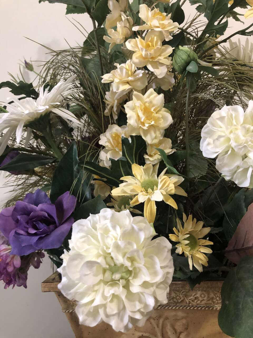 VenmoSurprisingly light-weight for how large it is. It has a metal "pot" with elegant scroll work imprinted around the upper edge, sides, and statement feet to raise it. The bouquet is a mix of florals and greenery and a mix of greens, golds, purples, and whites. It's definitely a statement piece.