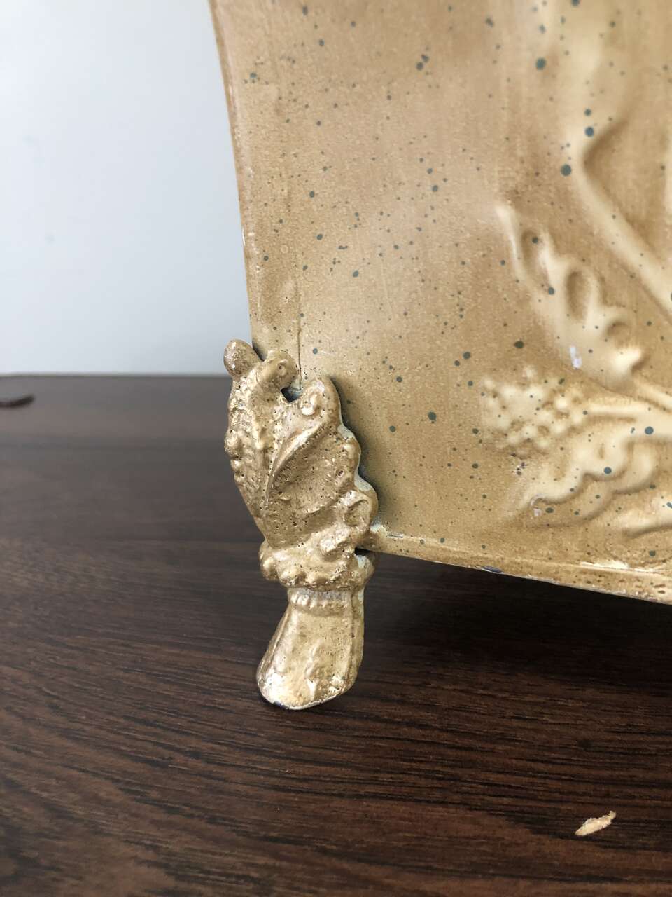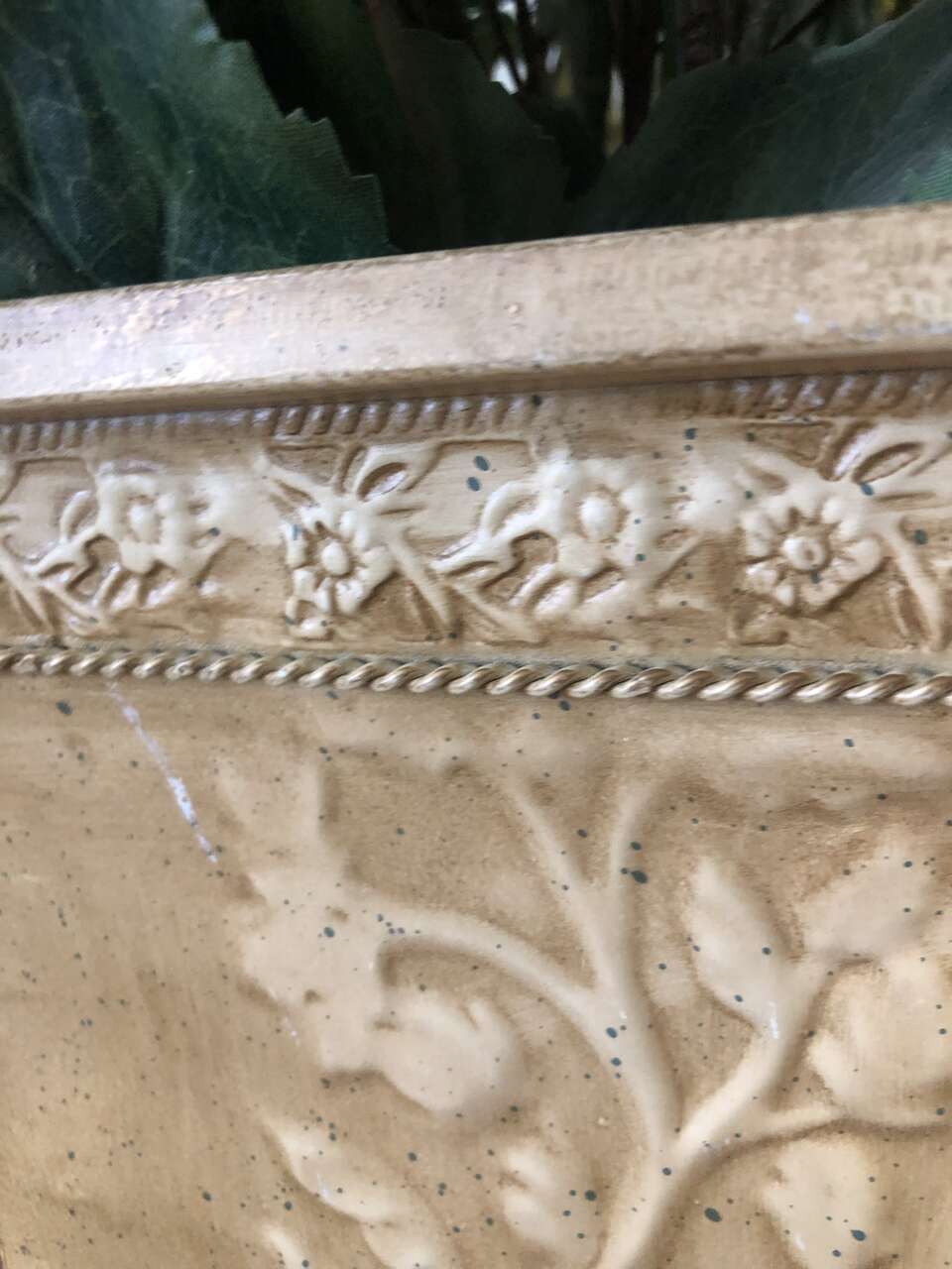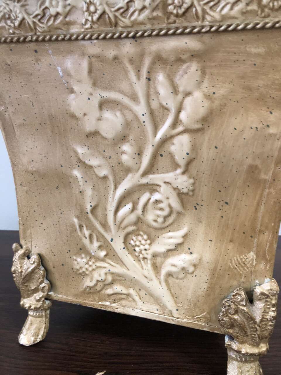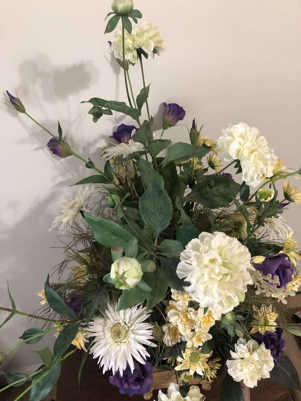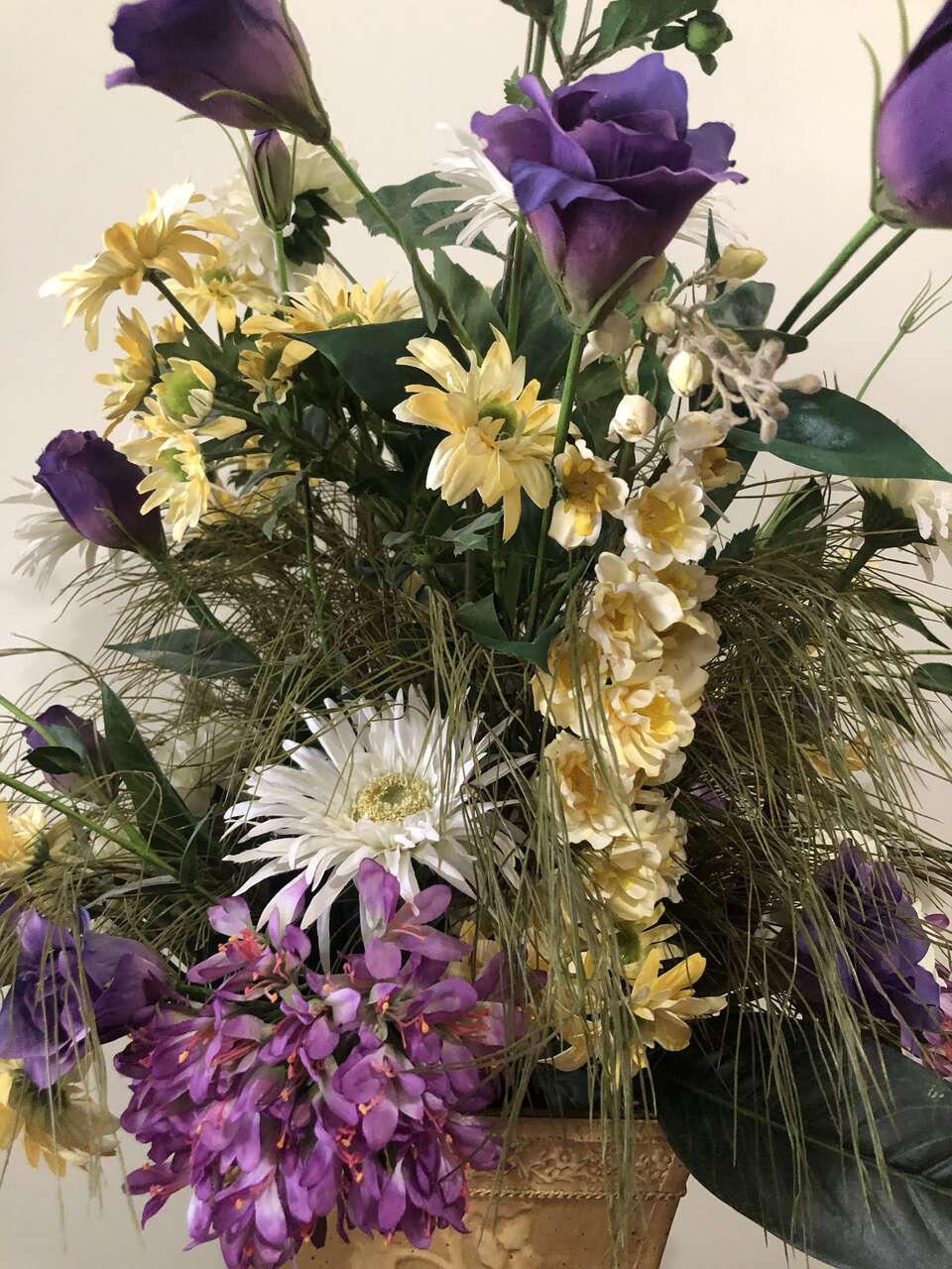 VenmoSurprisingly light-weight for how large it is. It has a metal "pot" with elegant scroll work imprinted around the upper edge, sides, and statement feet to raise it. The bouquet is a mix of florals and greenery and a mix of greens, golds, purples, and whites. It's definitely a statement piece.