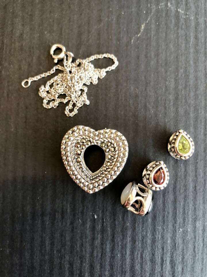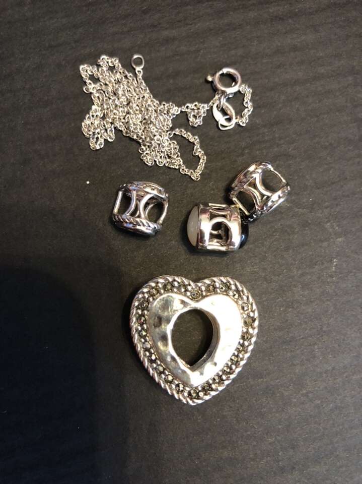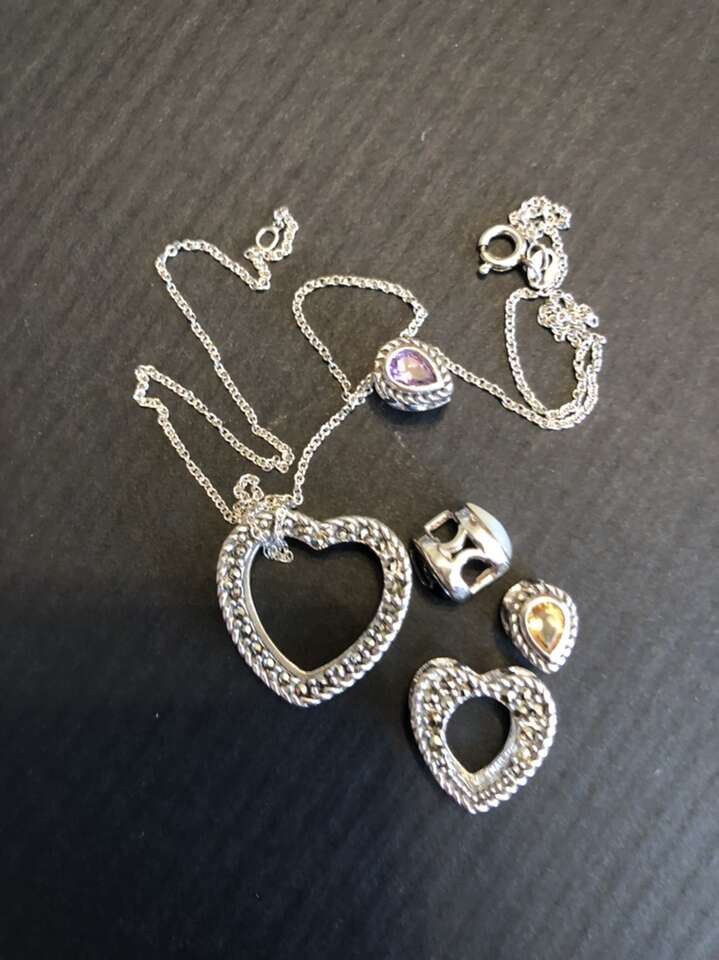 Fun double sided sterling silver heart pendant necklace. 19 inch chain can be strung dozens of different ways with double sided one inch heart and/or teardrops of six different colors (yellow, green, purple, red, white Pearl, or black). New in box!