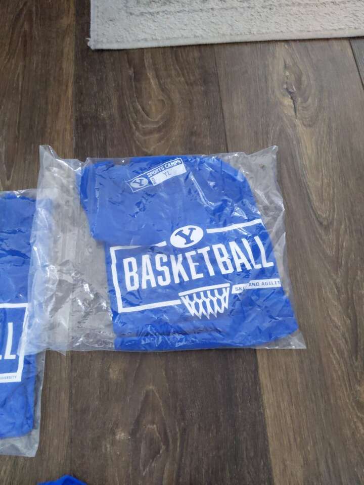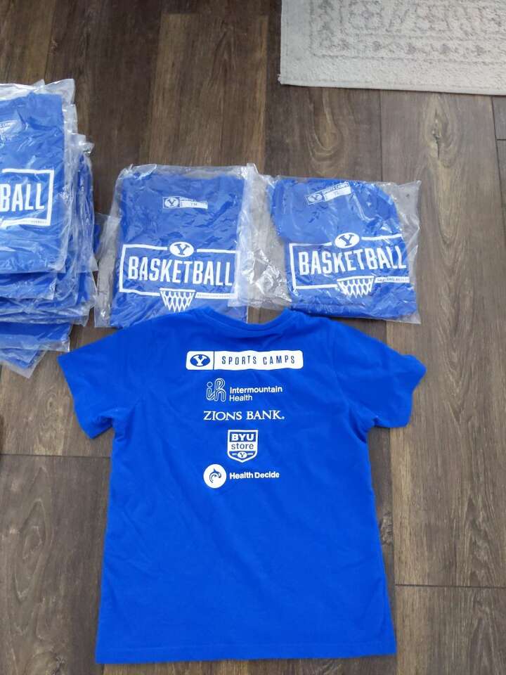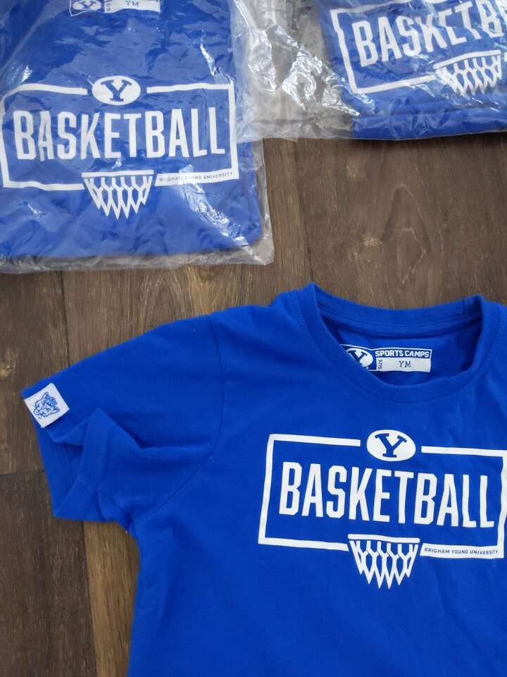Brand new basketball BYU tshirts boys and girls kids small, kids medium, and kids large. These come in a package.
