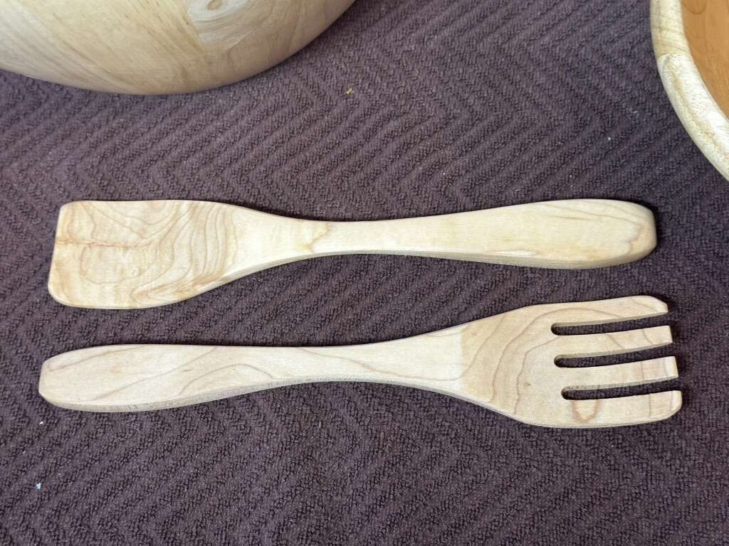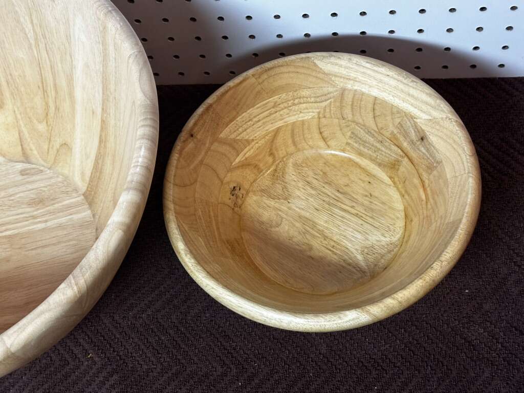 These thick Beauties have never been used! Comes with wooden Salad Utensils Big wood bowl 15Wx8H, other bowl 10Wx4H