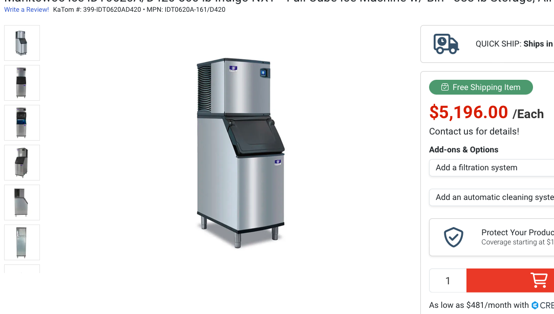 The Manitowoc ice maker and bin combo makes dice ice. These cubes measure 7⁄8 inch by 7⁄8 inch by 7⁄8 inch, and to ensure they are the correct size, a probe checks their thickness. They work great for bagged ice or for cooling drinks, and because they melt more slowly than other ice types, they water down beverages less. To help keep ice tasting pure, this Manitowoc Ice machine features antimicrobial-protected components in its food zone. This area is constantly in contact with water, so it contains several removable parts that enable staff members to thoroughly clean out bacteria and mold. In the Manitowoc ice bin, ice is saved until it is needed. The polyethylene liner is sanitary and simple to clean, and to remove moisture from the interior, a recessed drain is built in. An included holder provides a safe place for the ice scoop, holding it out of the ice to prevent contamination.
