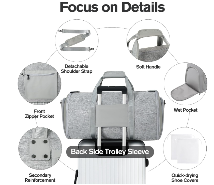 ZelleLarge: 24.1”L x 12.2”W x 12.1”H, 2 in 1 Convertible Suit Bag Travel with Shoe Bags - Large Light Gray