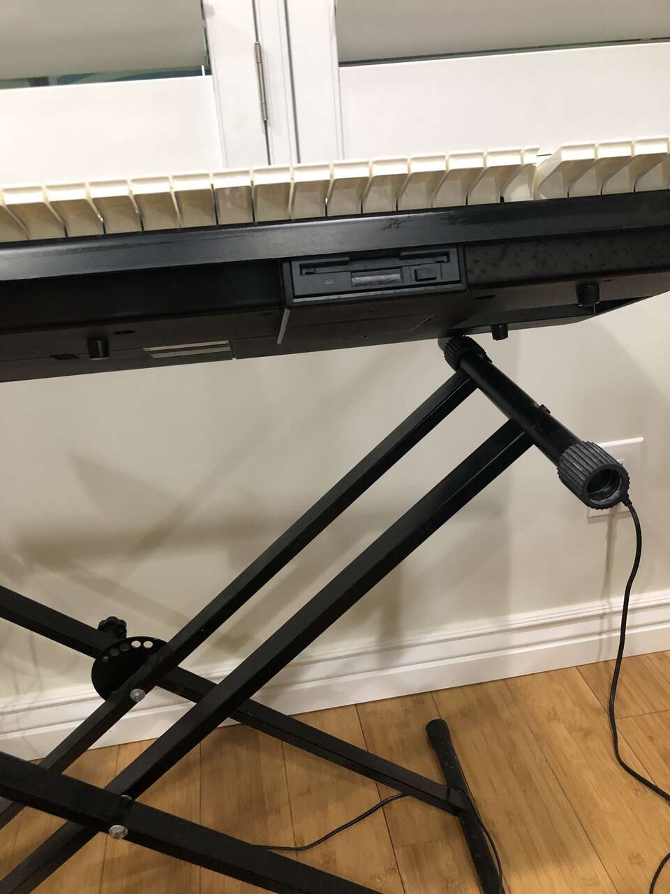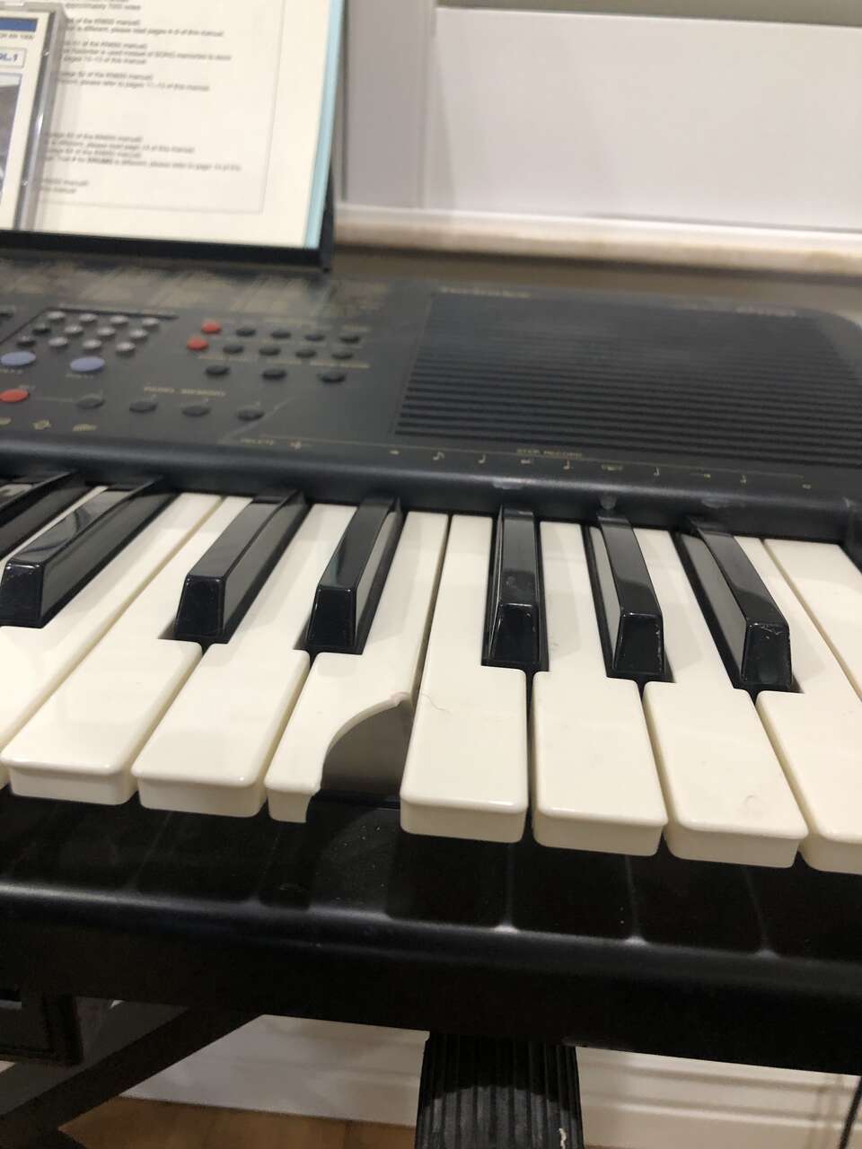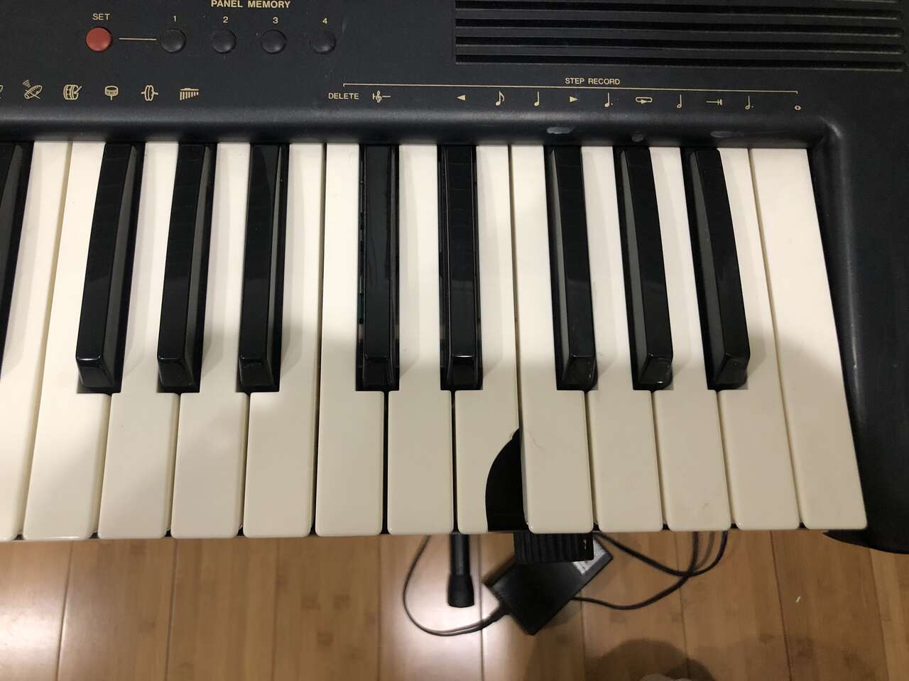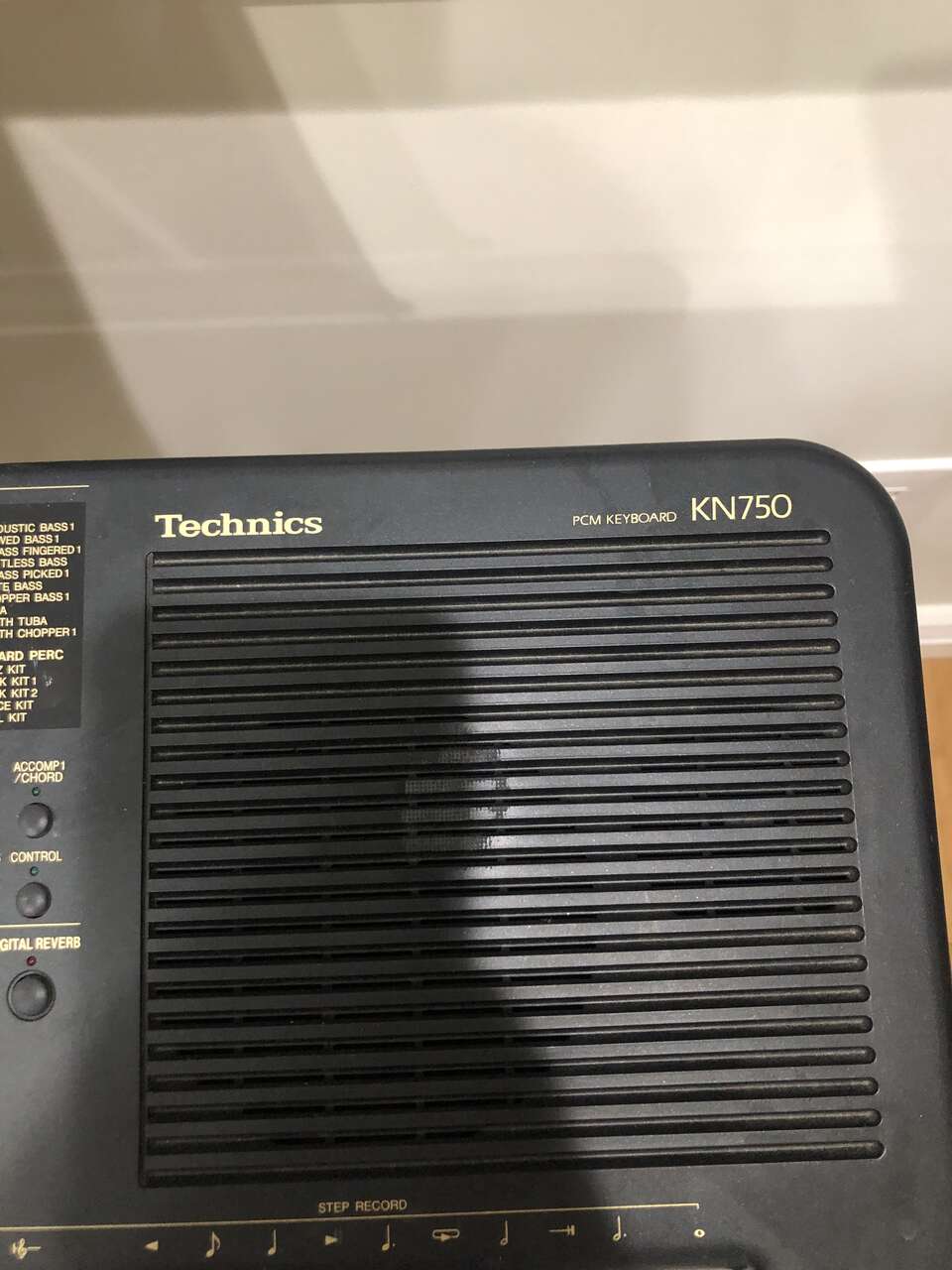 This Technics PCM Keyboard KN750 comes with a stand (it sits on top of it), 2 different manuals to help you compose and learn about the piano, a foot pedal, a cover (when it's not in use), a power cord, a floppy disk insert, a headphones port, and a CD to give you some starting ideas. It's 61 keys and has 1 chipped E key near the far right (still fully functional).