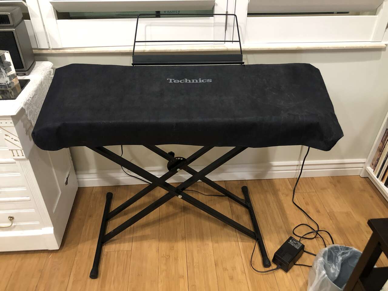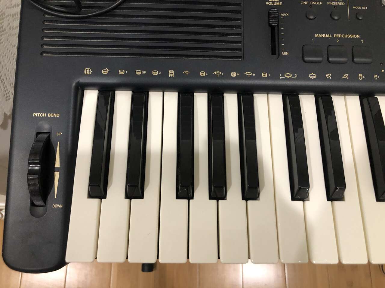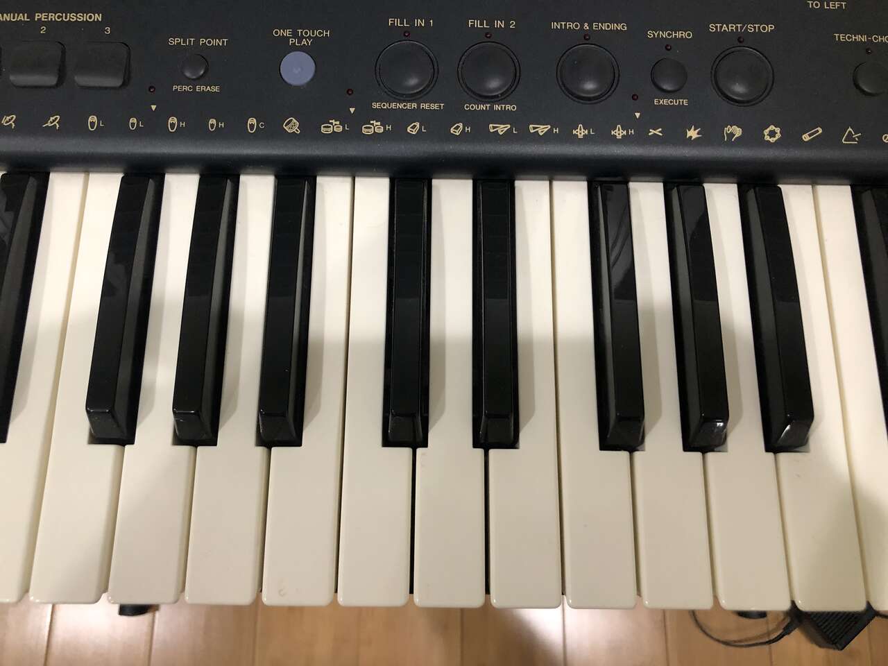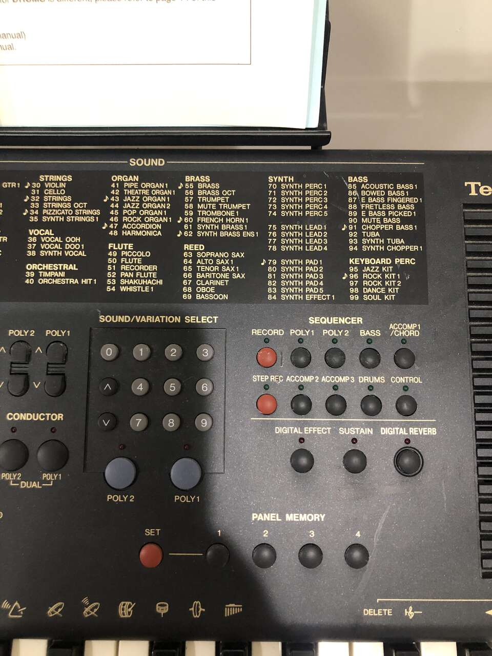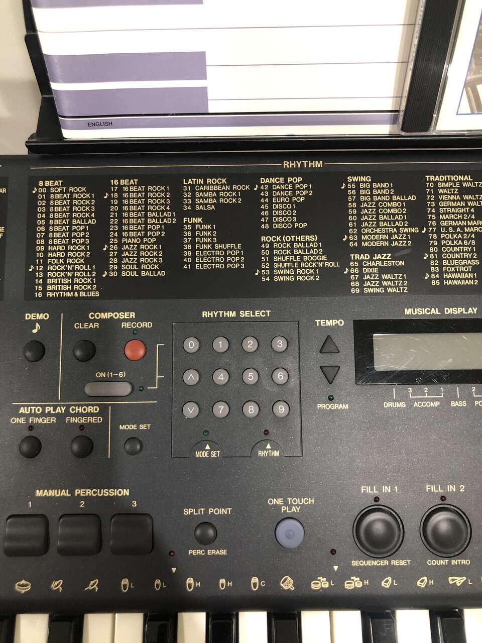 This Technics PCM Keyboard KN750 comes with a stand (it sits on top of it), 2 different manuals to help you compose and learn about the piano, a foot pedal, a cover (when it's not in use), a power cord, a floppy disk insert, a headphones port, and a CD to give you some starting ideas. It's 61 keys and has 1 chipped E key near the far right (still fully functional).