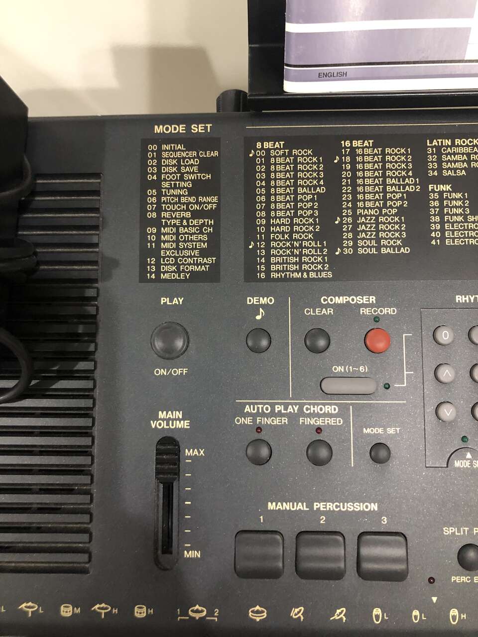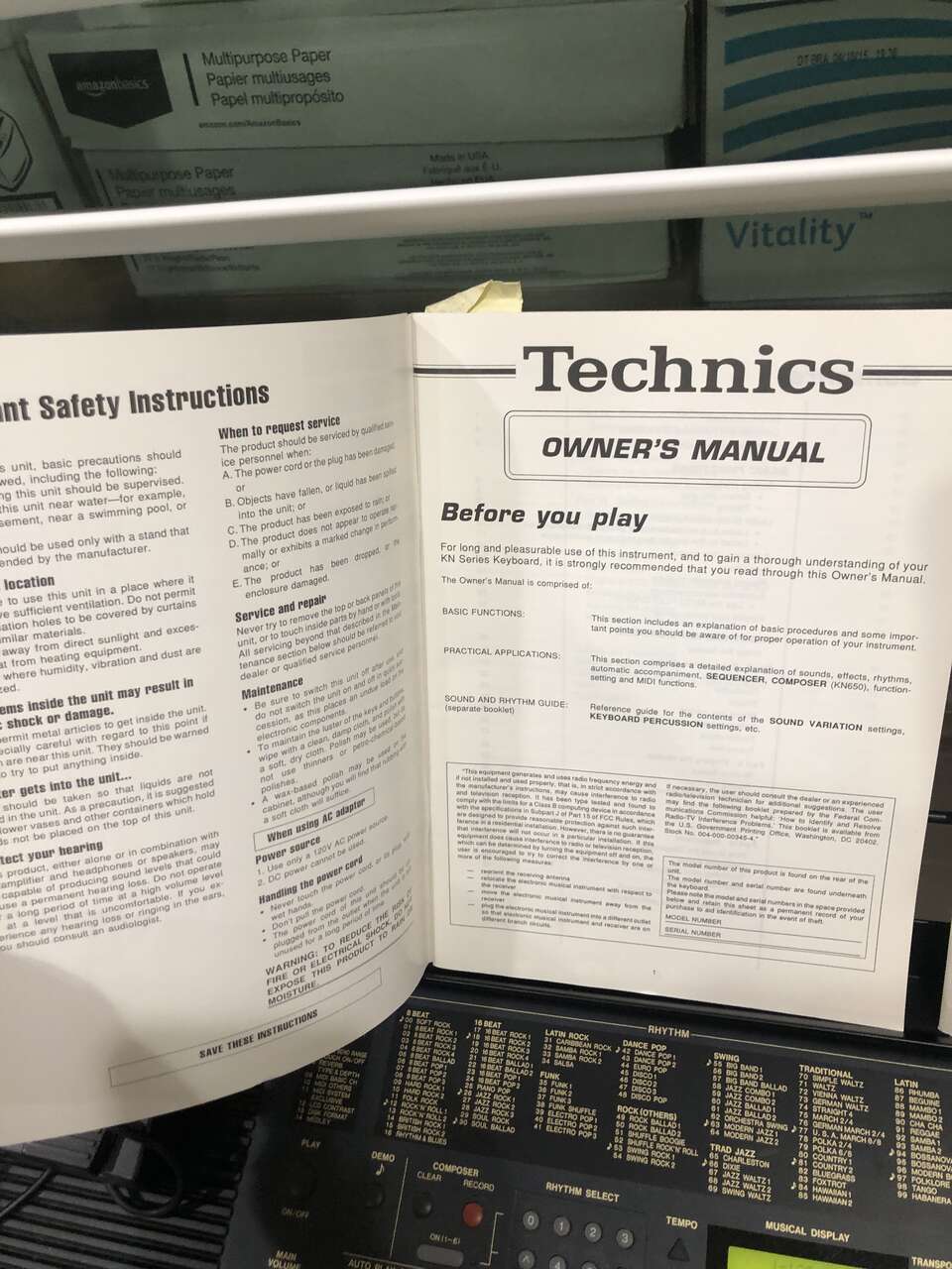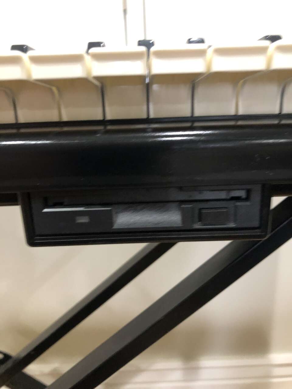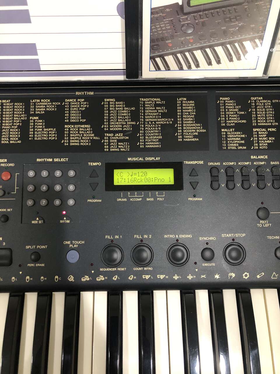 This Technics PCM Keyboard KN750 comes with a stand (it sits on top of it), 2 different manuals to help you compose and learn about the piano, a foot pedal, a cover (when it's not in use), a power cord, a floppy disk insert, a headphones port, and a CD to give you some starting ideas. It's 61 keys and has 1 chipped E key near the far right (still fully functional).