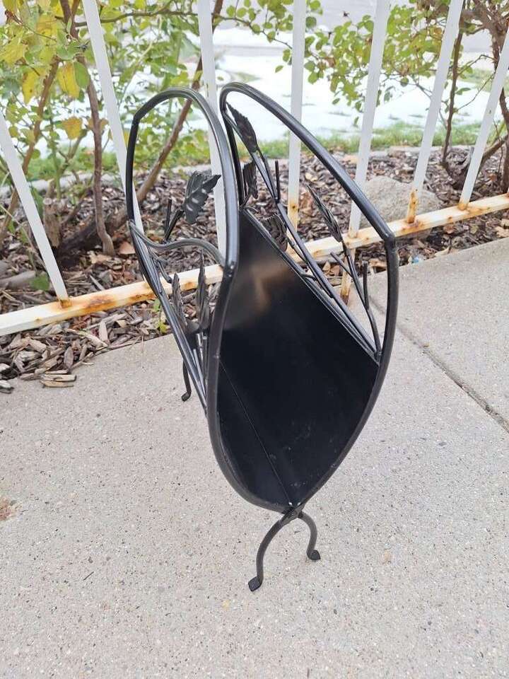 This is a cute fireplace Log Holder. Folds up. Leaf design. Recently sprayed with Restolium Black.