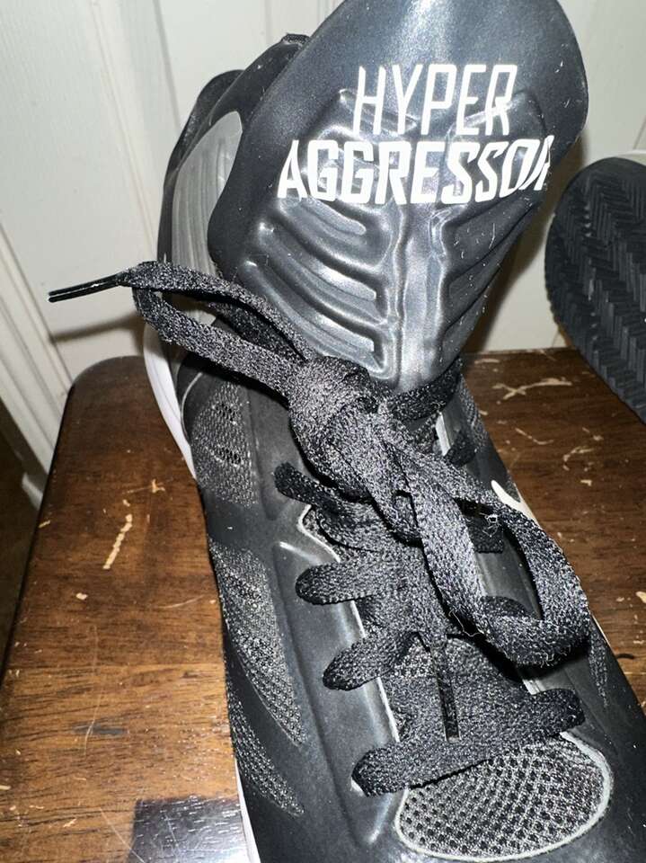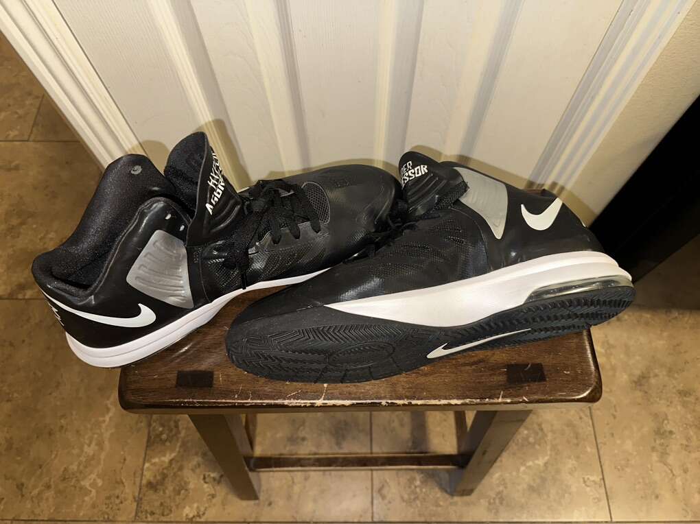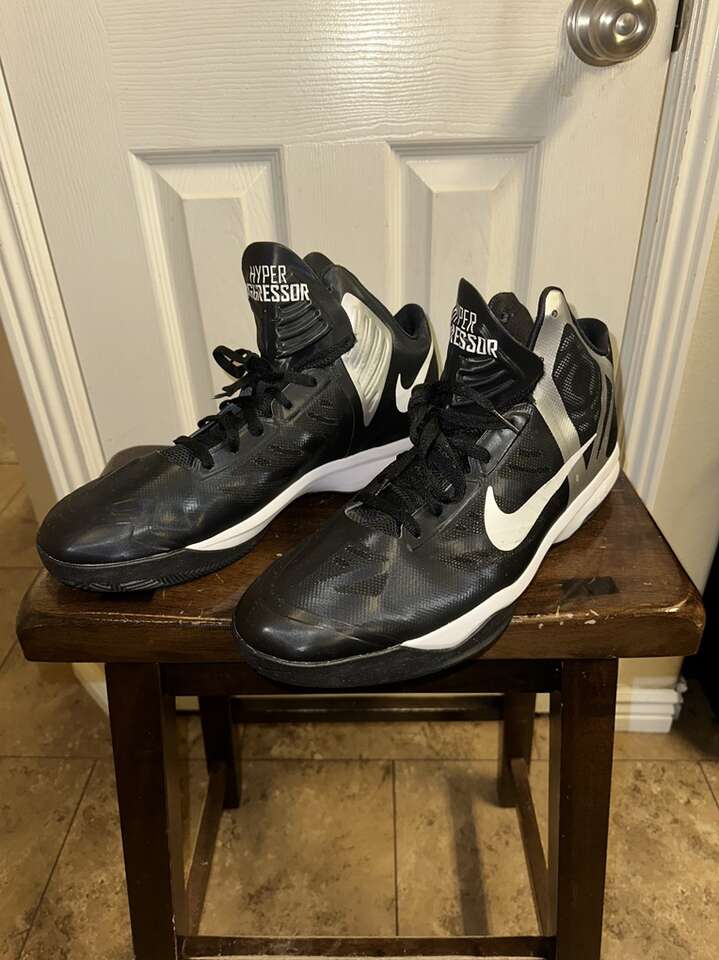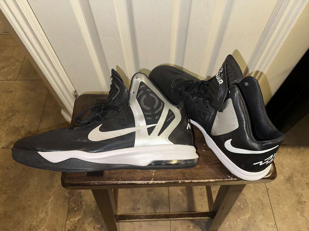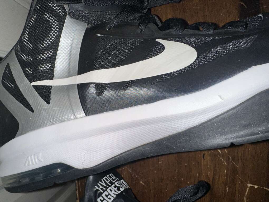 VenmoNike Air Max Hyper Aggressor Mens Size 15 524867-001 Black, White and Silver, used, no box, but good condition. One shoe lace tip is missing as shown in photos.