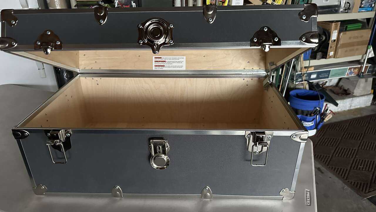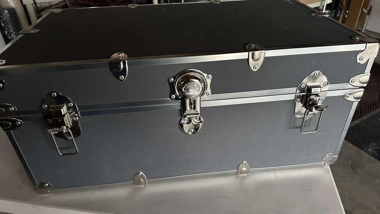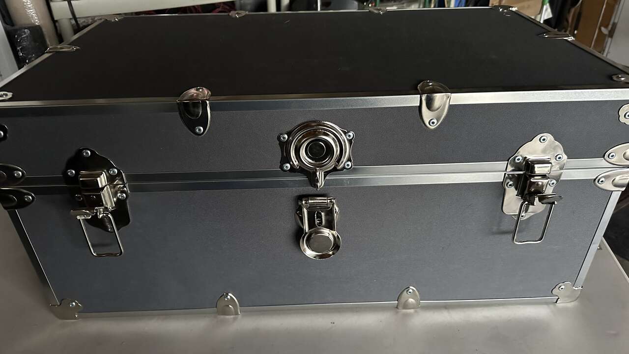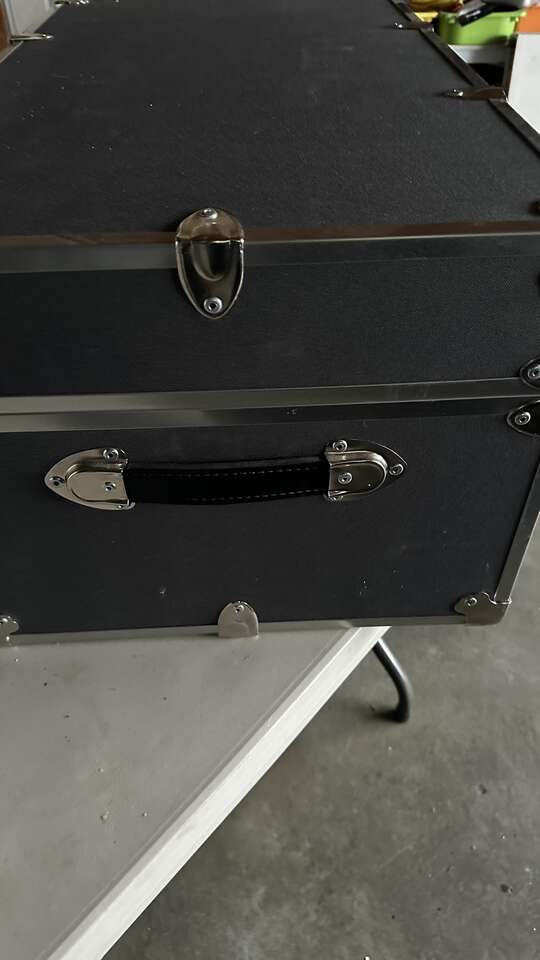 Brand new wooden interior and locking hardware/ hydr lift top but lightweigh and sturdy protective corners. Approximately 18X32 inches