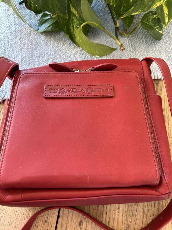 This handbag is like new. Very pretty red color, it is all leather Fossil brand. It is small: 9 1/2” tall, 9 1/2” wide, 2 3/4” wide at bottom. Has a wallet on the outside compartment. Inside is not extremely large