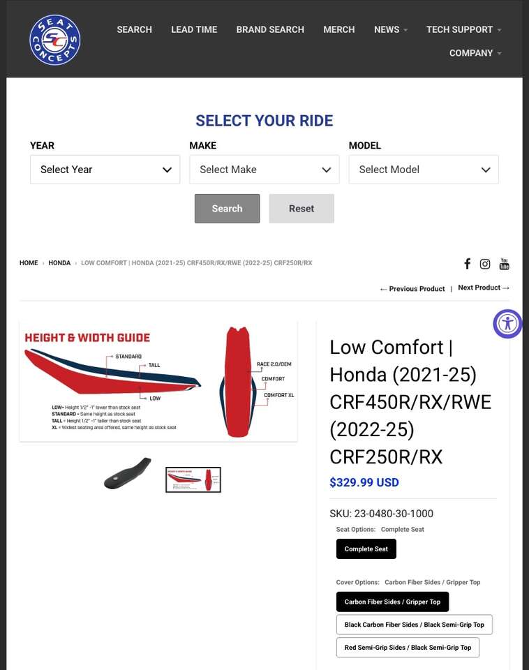 Slightly Used Seat Concepts Comfort Low Seat with Gripper Top and Carbon Fiber Sides. No Rips, Tears, Cuts or Scuffs. Fits (2021-25) Honda CRF 450R/RX/RWE and (2022-25) Honda CRF 250R/RX. $329.99 Retail Plus Shipping and Taxes. SKU: 23-0480-30-1000 Call, Text or Message. $200