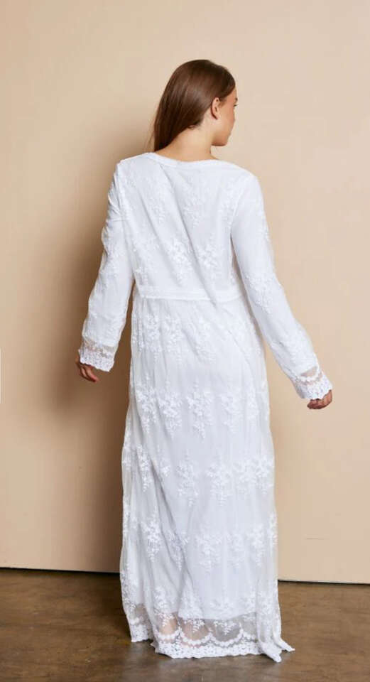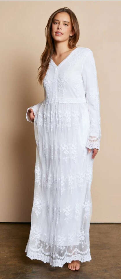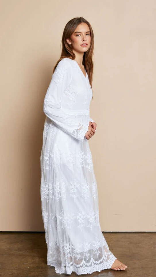 ApplePayExperience elegance and convenience with The Savannah Lace Temple Dress. Includes intricate lace embroidered tulle, and is double lined. Lace around the waist and neckline, the v-neck and long sleeves make this a must-have dress. Elevate your temple experience with this stunning piece. Last but not least - featuring pockets for your essentials.