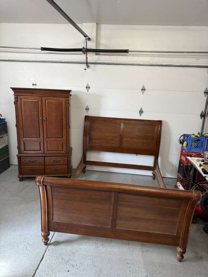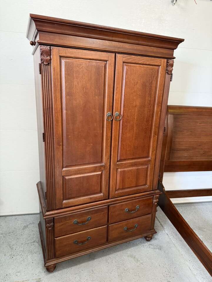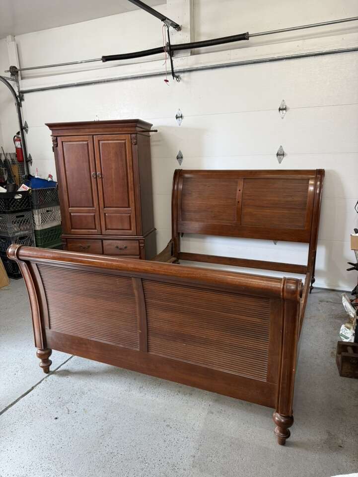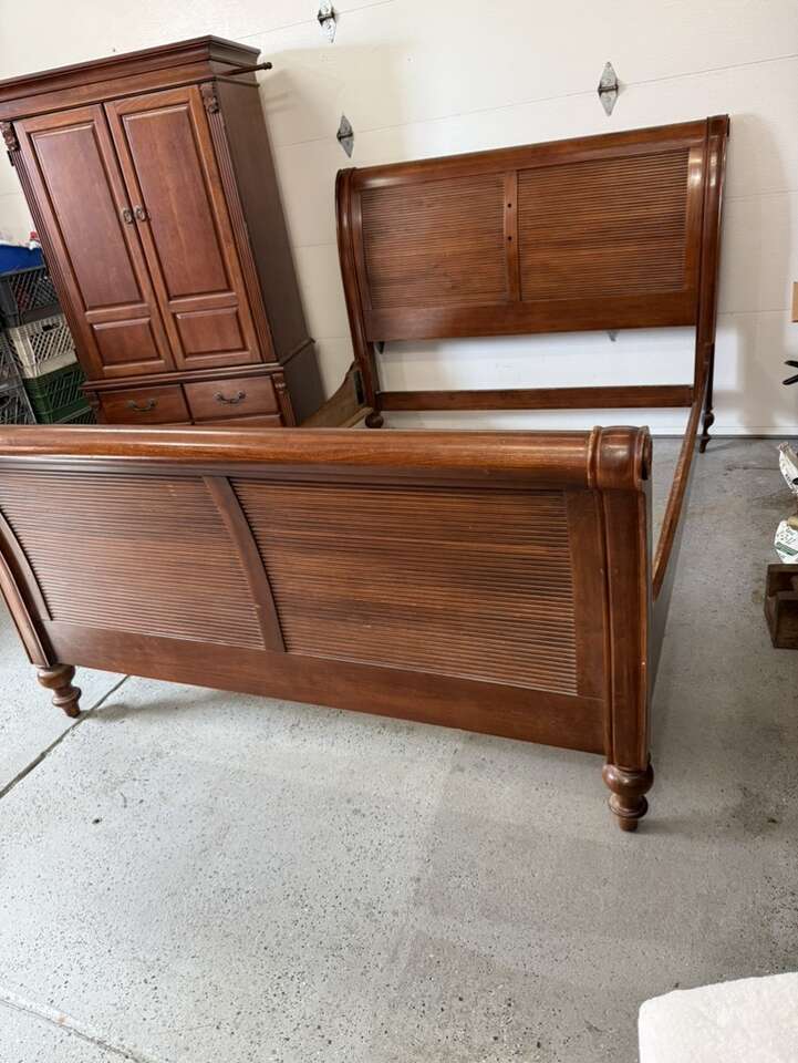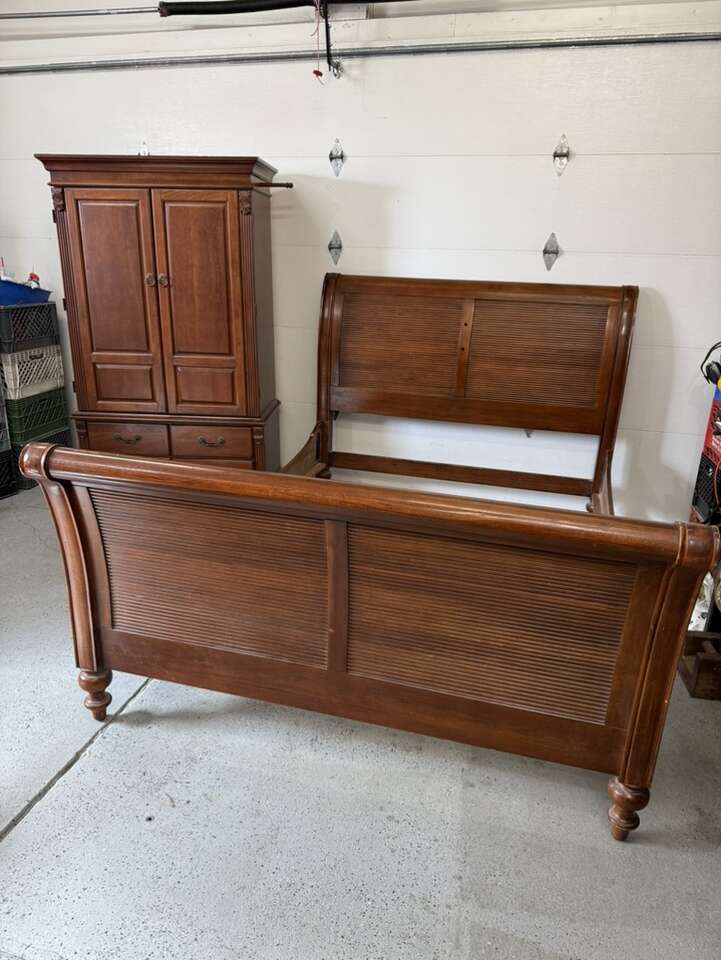 Queen sized bedroom set sleigh bed with armoire cherry wood armoire 42” L 72” tall 22” D European Can sell separate for $700 bed $400 armoire