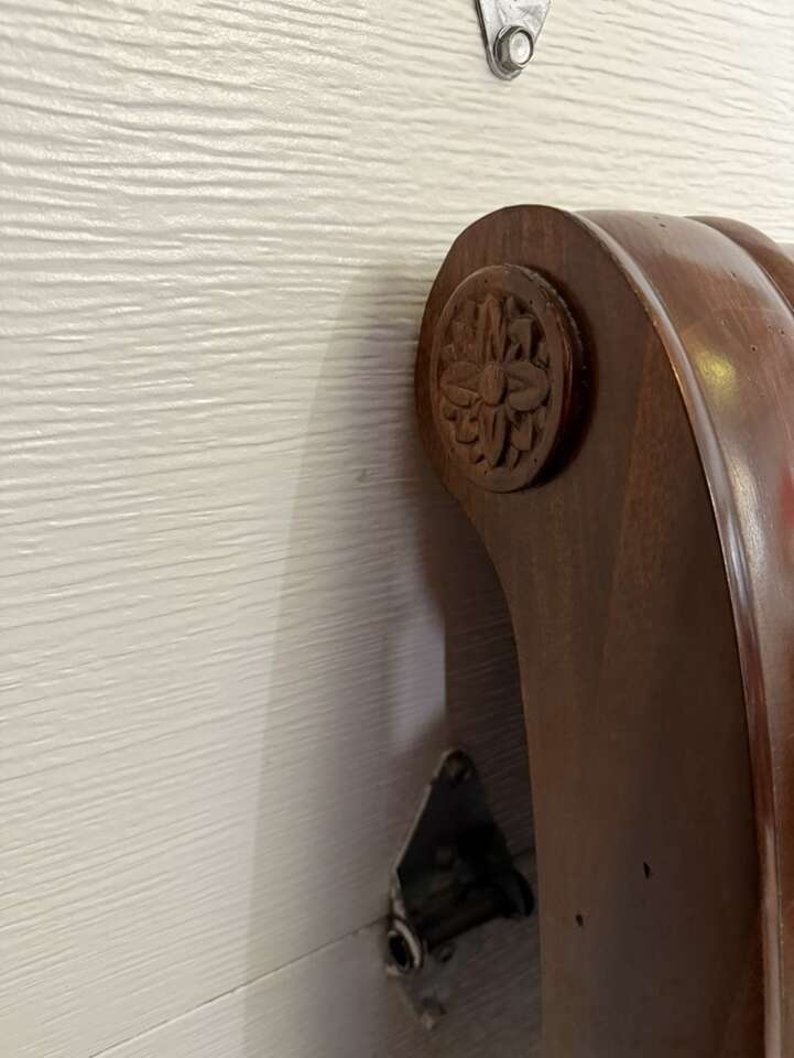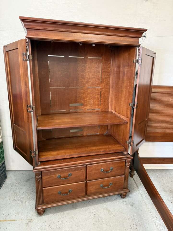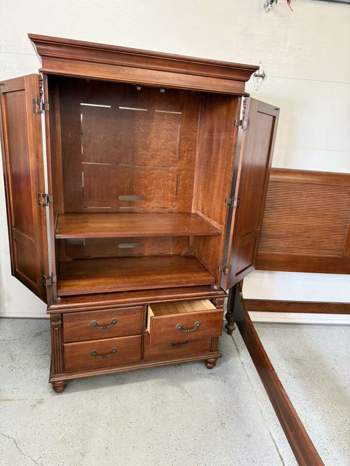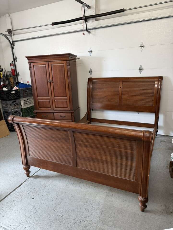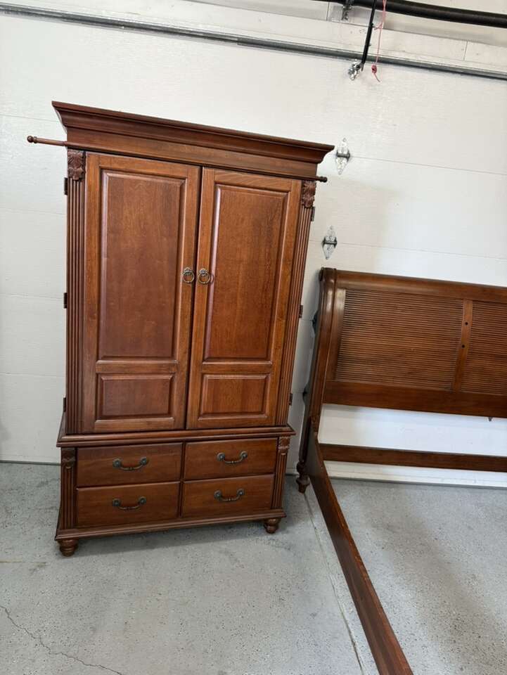 Queen sized bedroom set sleigh bed with armoire cherry wood armoire 42” L 72” tall 22” D European Can sell separate for $700 bed $400 armoire
