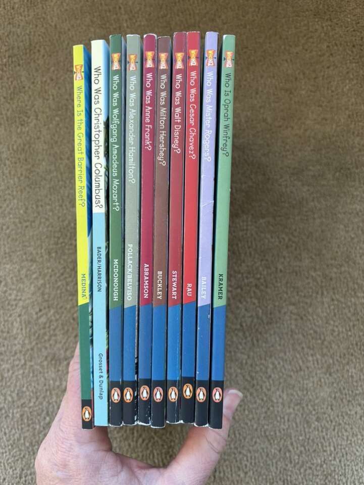 10 Who HQ Books (Who? What? Where?): Where Is the Great Barrier Reef? Who Was Christopher Columbus, Wolfgang Amadeus Mozart, Alexander Hamilton, Anne Frank, Milton Hershey, Walt Disney, Cesar Chavez, Mister Rogers, and Oprah Winfrey. Penguin Workshop, 2003-2019, about 100 pages each. Ages 7-10 years. Paperbacks in excellent condition. Text only. Cash or Venmo. Discount on multiple items.