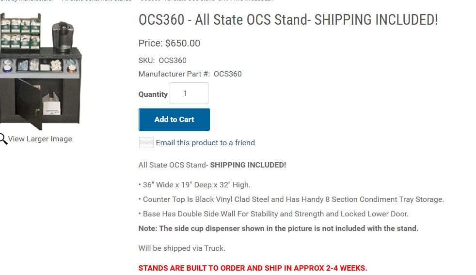 Specifications: Top 36.25″ wide x 19″ deep x 32″ high. Cabinet 36.25 wide x 17.5″ deep x 32″ high, with 4 cylindrical condiment cups and condiment tray.