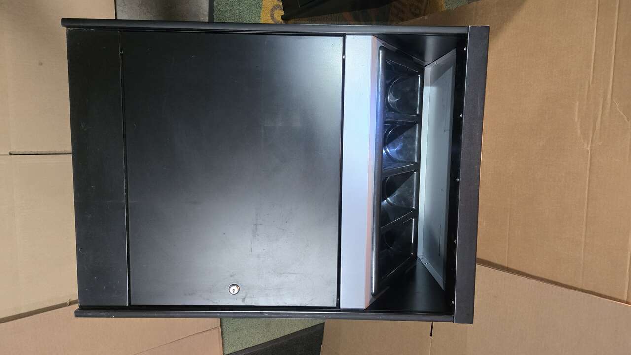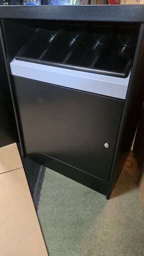 24"in. Self Contained Coffee Cabinet. Lower Storage with lockable door and Condiment Tray. Excellent Like New Condition.