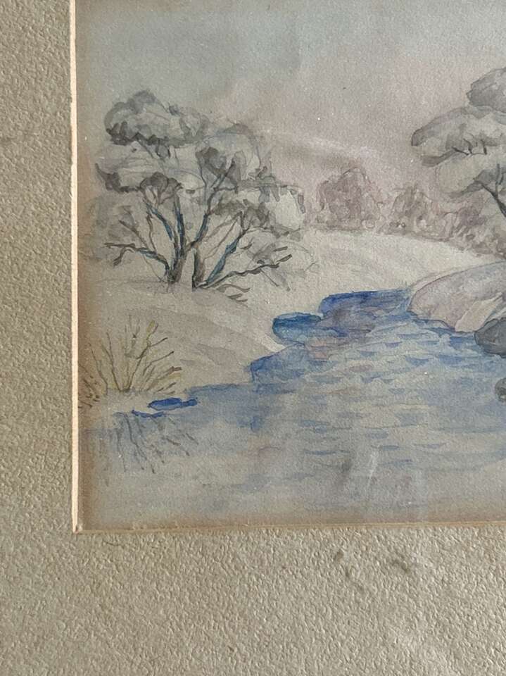 Small Antique Landscape Watercolor Painting. Frame size is 8.5x9,5 inches