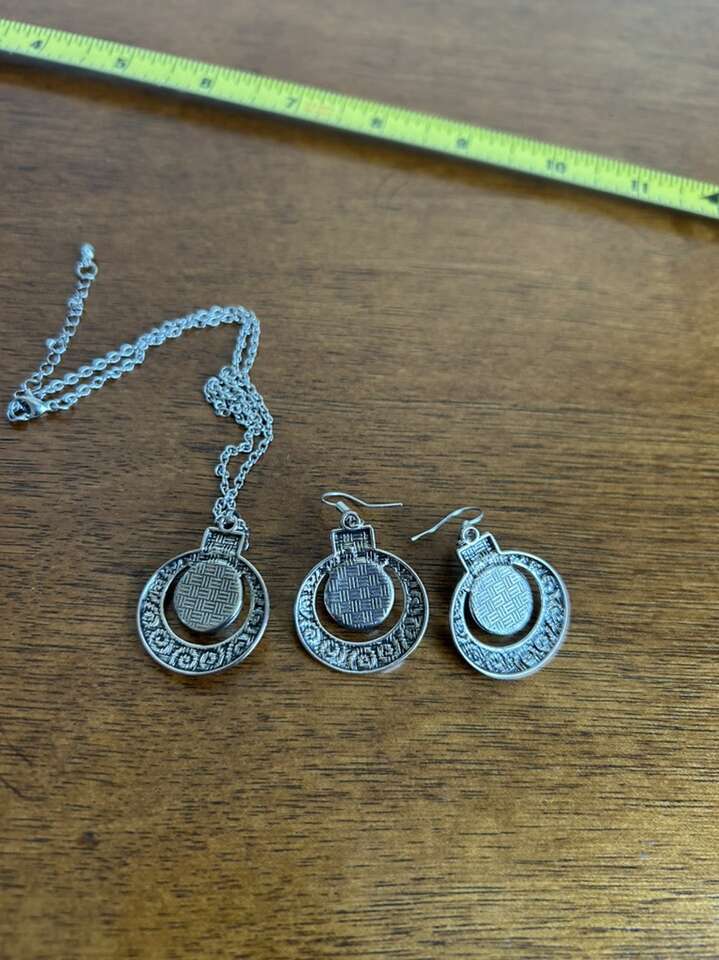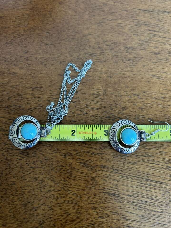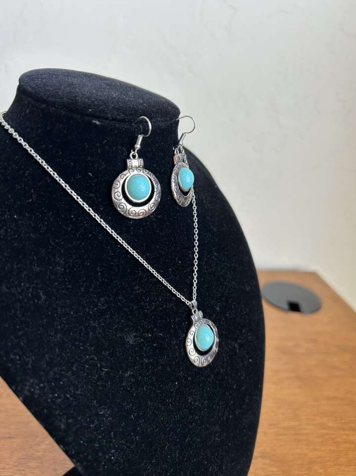 VenmoIn my new condition, silver tone, metal with faux, turquoise stone necklace, and Earring Set. Earrings are Circular design with fish hook. Necklace, pendant, matches earring. Lightweight. Clean smoke free home. Cash or Venmo porch pick up for Alpine.