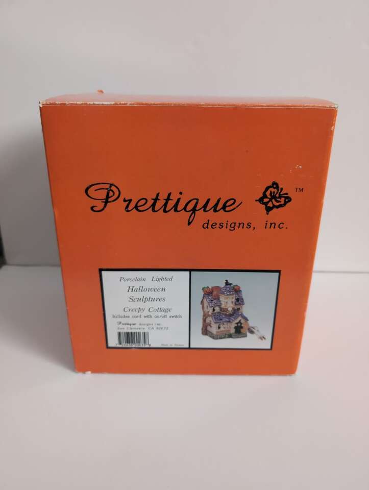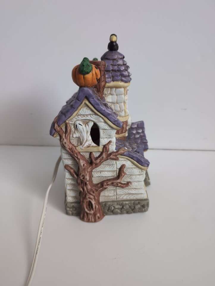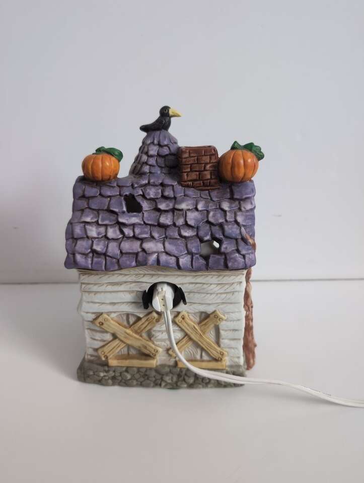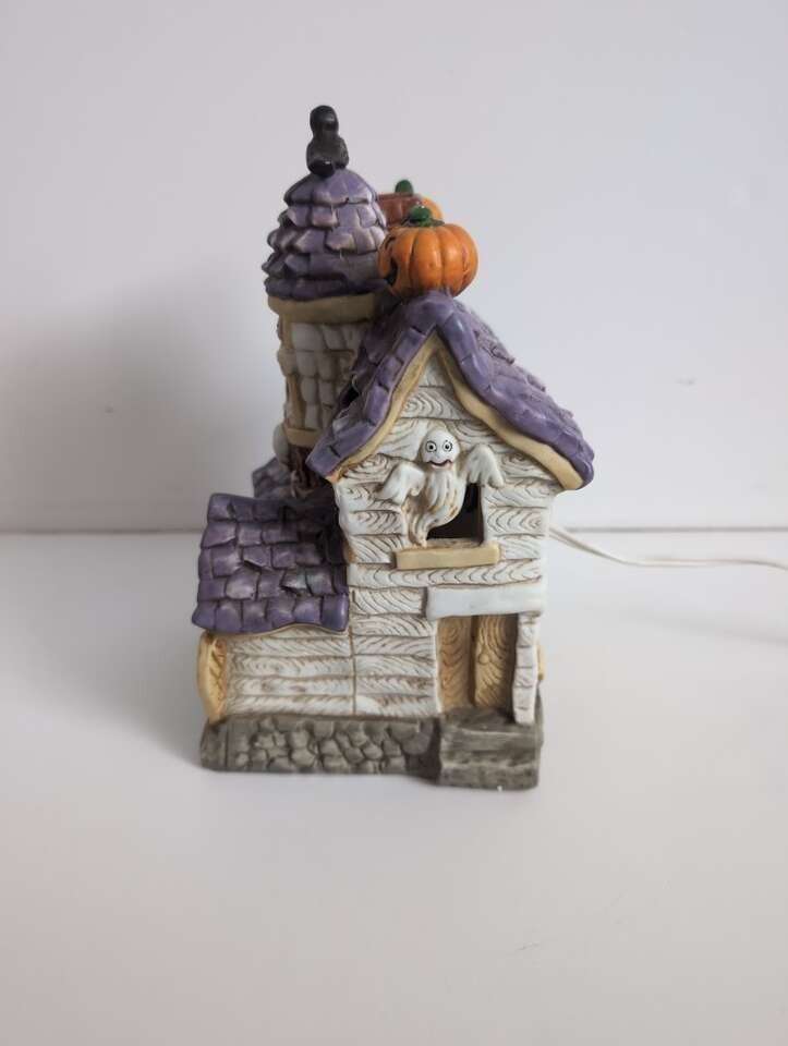 Ghosts, a which, pumpkins, cat, skull, and a crow - perfect for a haunted house! Cute as is or when you make it glow - can flicker or remain constant. Comes with Box. Porcelain.